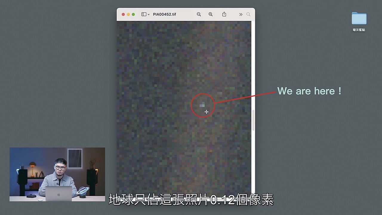 作品《如何使用AI提升照片品質|Noise Reduction、Super Resolution教學》中,藝術家擬仿YouTube上的影像編修教學自媒體,對「航海家1號」(Voyager 1)於40億英里外(64億公里外)所拍攝的一張地球照片,天文學家卡爾.薩根(Carl Edward Sagan)稱為「暗淡藍點」(Pale Blue Dot)的照片,進行AI降噪及AI超解析度等提升照片品質新技術的教學。值得注意的是,在這張以一台窄角鏡頭並使用了藍色、綠色和紫色的濾光鏡於黃道之上32°拍攝的照片中,地球的大小只佔整張照片的0.12像素。有趣的是,恰是這個極小的位元數,讓當代的AI演算法自動地將藝術家生活的地球「移除」了。