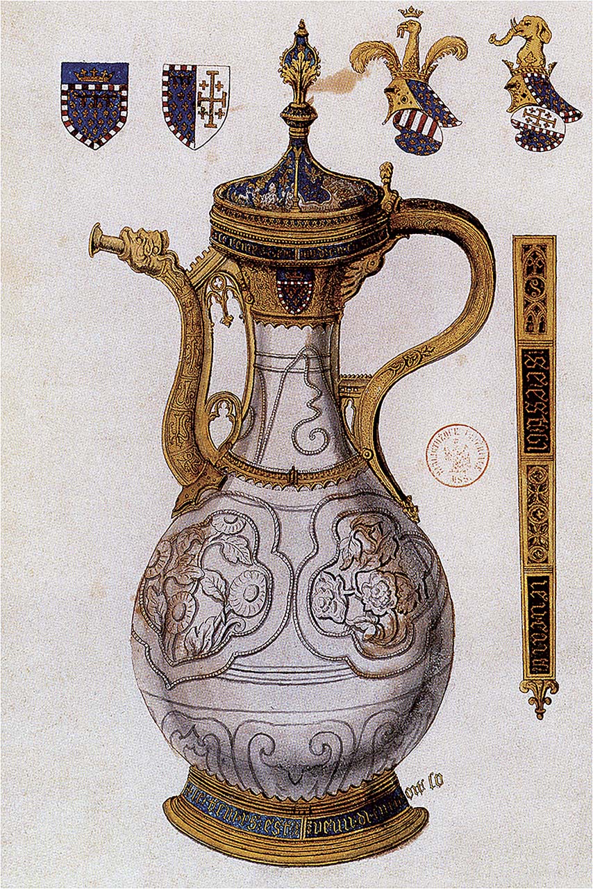 在幾件歐洲早期鑲嵌金屬裝飾的中國瓷器中,以一件元代晚期景德鎮出產的《青白瓷玉壺春瓶》最為人所熟知。此瓶現今還留有過去鑲嵌金屬附件的孔洞,透過傳世的水彩畫作也可推測當時其附加金屬裝飾的樣貌。