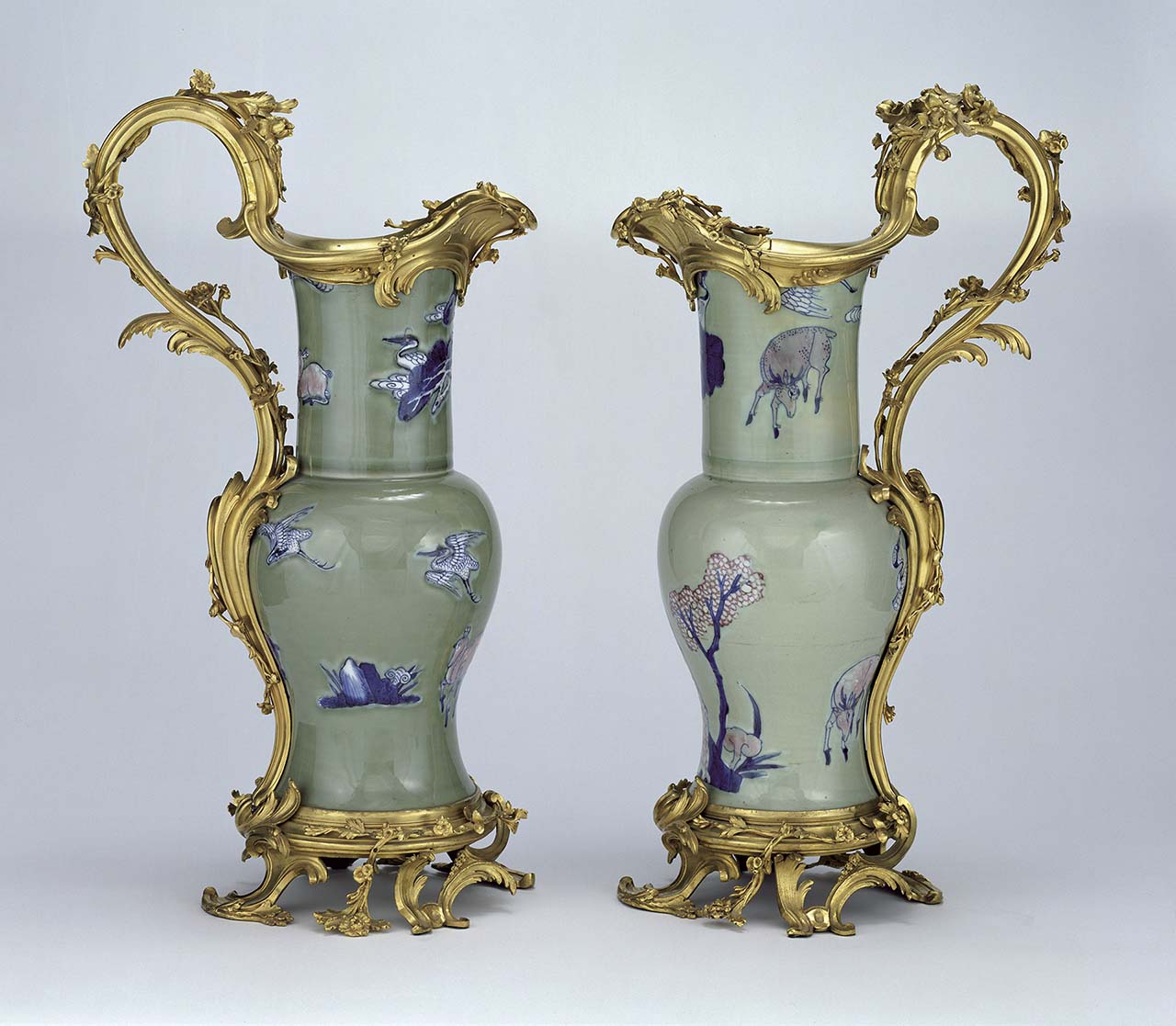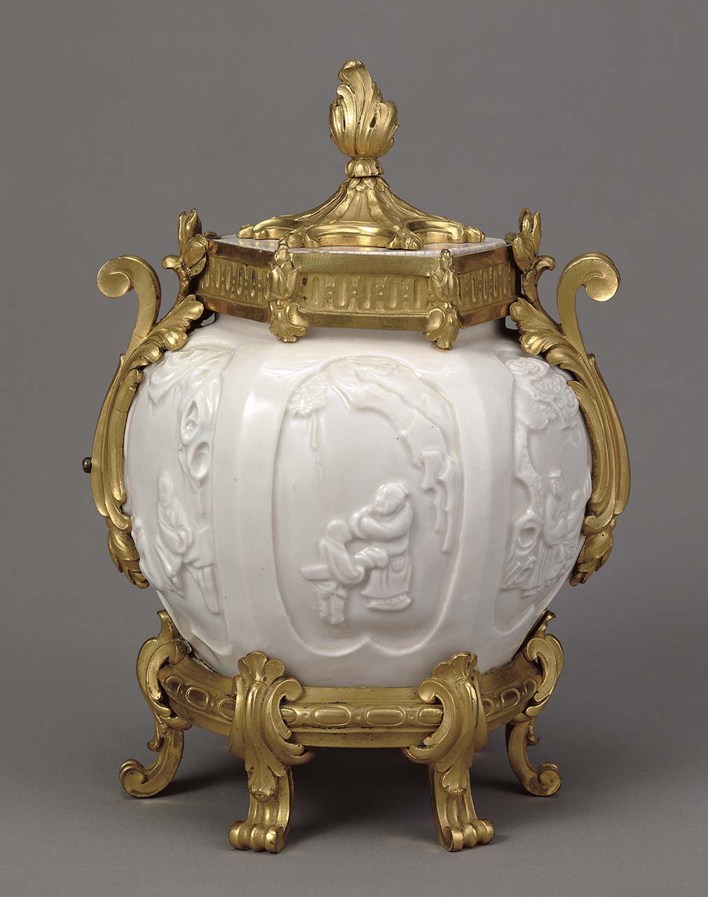 可見早期在法國、德國與英國都有在東方瓷器上鑲嵌金屬裝飾的情形。到了18世紀,德國雖仍在瓷器上加裝金屬裝飾,然此時加飾的對象卻轉以麥森(Meissen)瓷器廠仿製的東方瓷器為主,且這類金屬鑲嵌絕大部分亦不在德國本地製作,而在法國巴黎完成。英國方面,雖仍有對少部分東方瓷器進行金屬鑲嵌,然更大量的金屬附件也開始被鑲嵌到本地製作的瓷器上(註4)。