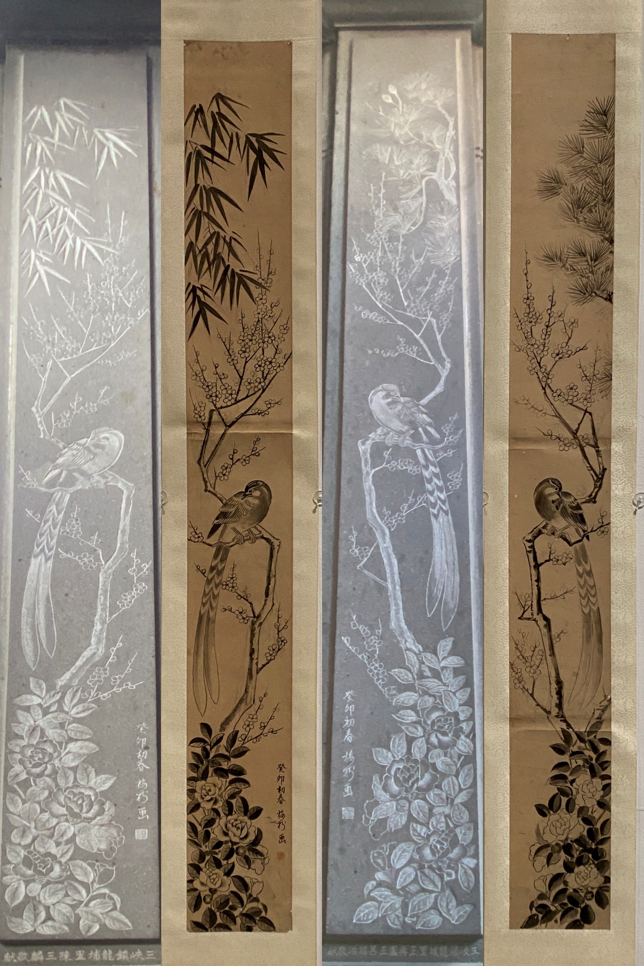第二類為李梅樹與藝術界友人所提供畫稿,製作為平雕作品。這類石刻出現在祖師廟前殿、中殿等處,李梅樹自己所繪製的作品約佔三成,其餘藝術家的作品約為七成。這批因為重建所需而繪製的作品,可以說是李梅樹創作生涯中少見的古典水墨創作,雖然在寫生觀念的影響下,李梅樹大多繪製的鳥禽多為可以分辨的種類,而非傳統粉本的陳套,但為了廟宇風格及其他邀請的藝術家創作整體的協調性,仍是以傳統的花鳥畫布局所繪製,在李梅樹以油畫作品為主的創作中顯得獨樹一幟。而李梅樹所邀請的藝術家,包括林玉山、郭雪湖、陳進、陳慧坤、盧雲生、李秋禾、林之助、陳丹誠、歐豪年、蘇峰男、黃昌惠、涂璨琳、李義弘、李春祈等人,既有與他同輩的膠彩畫家,也有他在國立藝專任教時結識的水墨畫家,呈現出當時台灣水墨領域的一個切面。