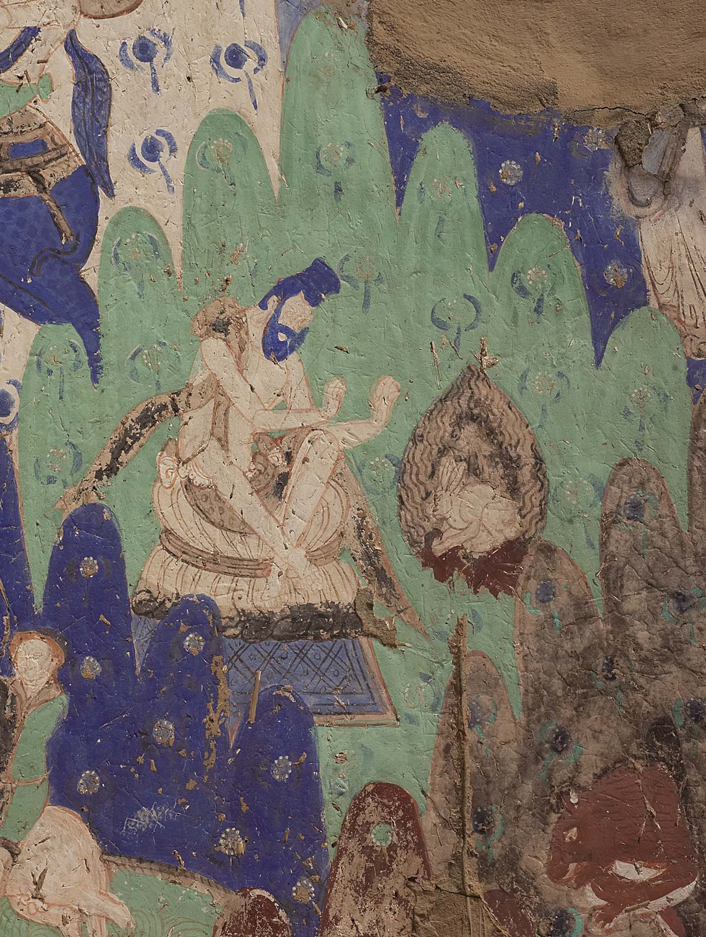 兔本生故事,是龜茲石窟最為流行的本生圖像之一,現存22例(註1)。古代龜茲位於古絲綢之路新疆段北道要衝,歷史上曾經是佛教興盛之地,佛教石窟眾多。今日位於新疆地區的克孜爾石窟,始建於公元三世紀左右,止於公元八至九世紀,是古龜茲境內規模最大的一處石窟寺遺址。石窟中第14窟的主室彩繪《兔焚身施仙人》壁畫,故事以單景敘事刻畫了「兔王焚身」的場景,螺髮赤身、腰纏鹿皮的婆羅門正慌張地擺手。他面前的白兔俯身躍入燃燒的柴火中,勾勒出整個故事的高潮。