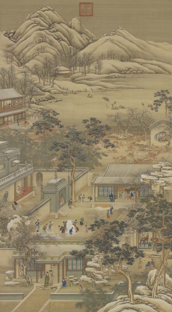 十二月月令圖共12軸,清乾隆初年由宮廷畫家合作完成。本軸十二月,描繪宮廷雪景,以西洋透視法繪製庭園景致,遠景見雪山靄靄,孩童在湖上滑冰嬉戲;中景有鹿苑,人們在主建築內圍爐取暖,庭中三兩成組的人群,有的閒立,有的掃雪,眾人視線集中在以白雪堆起的雪獅身上;近景院外見孩童放炮竹、踢毽子,玩得興高采烈,預示新的一年即將開始。