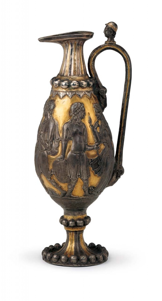 銀瓶表面鎏金,環形單把,把上方鑄一高鼻深目的人頭,瓶口為鴨嘴狀流。細長頸,頸部、腹部、足部相連處飾聯珠紋一周。瓶腹上部有一周三角形連瓣紋;中部鍛打出6個人物圖像,半浮雕,工藝精湛;下部剔刀淺刻線雕水波渦紋一周,水波中有兩隻大耳、怒目的怪獸相向追逐一條翻身躍起的魚。銀瓶腹由左至右兩人一組,分為左、中、右三組人物故事,源自古希臘《荷馬史詩》神話傳說。中間一組人物畫面表現「帕里斯的裁判」故事,天后赫拉、智慧女神雅典娜與愛神阿芙蘿黛蒂為了得到刻有「獻給最美女神」字樣的金蘋果而爭執,最終以愛神承諾裁判帕里斯將得到人間最美女子海倫為妻的條件,贏得金蘋果。畫面為帕里斯手拿金蘋果,欲遞給愛神。右邊一組人物為帕里斯劫持皇后海倫的情景;最左一組人物表現海倫回到丈夫斯巴達國王墨涅拉俄斯身邊,由於爭奪海倫引發特洛伊戰爭,死傷無數英雄,墨涅拉俄斯在追回海倫後準備將其殺死,但終因其貌美如斯,未能忍心。