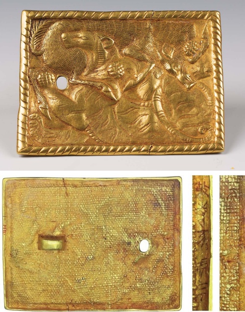 戰國時期北方出土金器受到歐亞草原狩獵文化影響,裝飾主題多以動物紋為主,以形象活潑靈動為特色。同時期鄂爾多斯高原及周邊地區出土大量金器,多以動物紋為題材,採用浮雕手法,具有強烈立體感。西溝畔匈奴墓出土金器22件組,金器的刻款屬戰國字體,經比對後其年代不晚於秦朝。其中〈虎豕咬鬥紋金帶飾〉,飾牌整體略呈長方形,周邊飾一周繩索紋,正面圖案為淺浮雕定格了猛虎和野豬撕纏繞咬鬥的瞬間,野豬在上,猛虎在下。猛虎腹部著地,前肢極力撐起上軀,昂頭張口狠狠咬住野豬後腿,後肢翻轉朝天蹬踏野豬,虎尾下垂經襠部由後向前彎卷至背部;野豬雖處於劣勢,但仍緊咬著猛虎一後肢,奮力反抗,雙方廝殺得難解難分。帶飾背面滿布失蠟法鑄造時留下的粗麻布印痕,背面左側有一橫向的扁平橋型鈕,右側一橢圓形孔,有明顯使用磨蝕痕跡,應該為帶鉤鉤掛所致。背面靠左、右兩端的邊緣處,豎向直行鏨刻「一斤二兩廿朱少半」及「故寺豕虎三」款,為戰國晚期秦人書風。