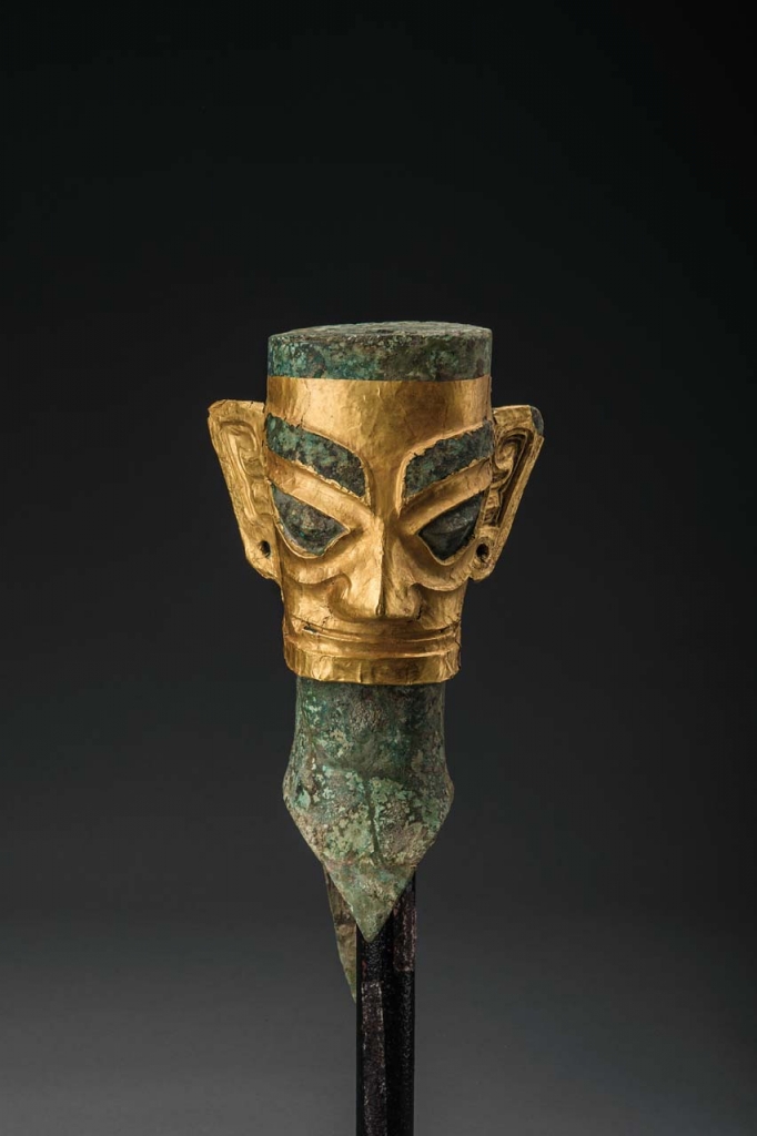 距今3000多年前,古蜀地區是早期黃金製品重要分布地之一,其黃金製品獨具特色。四川三星堆遺址出土了金杖、金面罩、金箔虎形飾等60多件金器,其中〈戴金面罩青銅人頭像〉與其他地區以金面具覆蓋於逝者面部的喪葬用途。不同從三星堆兩個祭祀坑共出土了青銅人頭像50多件,戴金面罩的銅人頭像卻只有4件,說明古蜀人已經視金為尊貴的象徵,它們代表著有特殊身分和地位的人。人頭像作為常設於神廟中的祭祀神像,在面部貼金,其目的絕非僅為美觀,而是用來供奉神靈,作為人神溝通的媒介。這類戴金面罩的人頭像,在商周時期中國其他地區和其他文化中幾乎不可見,屬於古蜀青銅文明特有的文化現象。整件金面具由自然金鍛打而成,採用錘鍱、剪切、鏨刻、鏤空、包金等多種製作技術,金光熠熠,展現古蜀金器極高工藝水準,代表商周時期中國黃金藝術的巔峰。