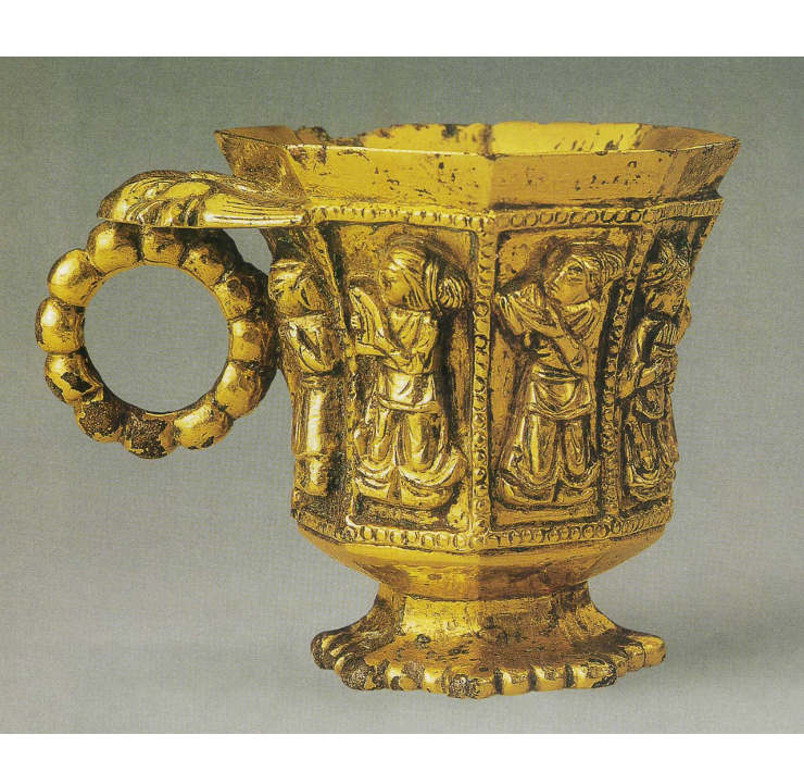 唐代〈伎樂紋八棱金杯〉