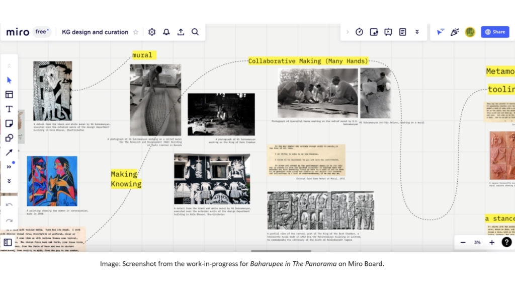 相較之下,Samira Bose則提出另一種展示方法的概念,源自印度藝術家K. G. Subramanyan所撰寫Art and Craft Panorama in India一文中,定義了Panorama的重要性,是以客觀的方式展現全部的面貌,讓作品與文件自己說話,相較於帶有詮釋性的組織檔案方式則是主觀性的展示。因此,除了以K. G. Subramanyan於Asia Art Archive in India的線上文件歸檔之外,更另外以他為主題設計了另一個以miro系統為視覺表現的線上展覽,試圖將Panorama此一理念透過線上數位技術更貼近理想中的展覽全貌。如果說展覽最珍貴的莫過於觀者的體感與空間感,特別是立體作品如何被「數位歸檔」的問題,Samira以雕塑家Mrinalini Mukherjee 為例,藝術家對於作品如何被數位影像拍攝保存的細節非常要求,並要求所有角度都要拍攝保存。同時也會與攝影師討論技術上如 何呈現最忠實的作品原貌,畢竟燈光與位置都會影響作品本身被觀看的感覺。縱使現代有許多3D維度的技術能如實呈現作品,但他們也會在檔案化的過程中思考全新的呈現方式,例如線上檔案可以做到實體檔案達不到的效果,可應用縮放或互動功能等,激發觀者產生另類的閱讀體驗與想像,而非一定要侷限於高科技所再現的真實樣貌,作品如何在檔案化的過程中以創意的方式再展示,是團隊的首要考量。