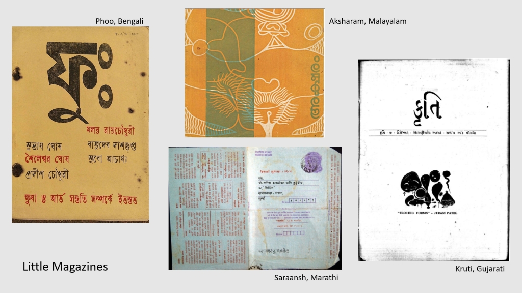 只是,若一昧崇拜數位世界的刊登與閱讀模式,難道紙本刊物終究要絕種了嗎?呼應這項命題,Noopur Desai則提出了另一套具有高度獨特性的反指標,亦即於1950至1980年代,以多樣化語言出版的獨立刊物,並大量活躍流通在印度各地,現稱為Little magazine Movement。其最大特色在於採用印度多重語言出版(註2),經常以實驗性的手工製作、繪製封面與創新印刷技術等特性,以及少量甚至只有一本的限量發行模式,其流通管道多以展覽或私人聚會分享的方式傳遞,具備神秘的游擊特徵。此外,圖像設計上多以文字轉化為符號的方式,將文字視覺化,縱使有許多語言已經瀕臨滅絕。這些刊物在當年出版的動機,絕不同於現代人追求資訊快速與即時流通的時效性,如何將語言與文字精緻化與藝術化,反而造就了永恆的藝術精神,即便不懂其內容,光靠視覺化的圖像,也是另一種藝術魂的溝通模式。而這些神秘的刊物,也成為另類的檔案資料,是介於藝術創作與文字檔案的一體融合。