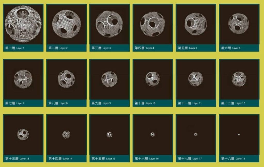 象牙球的製作,是將象牙先用車床鏇成球體,在圓心處開十四個錐形孔,用直角鈎刀在錐形孔中,由內而外一層一層刻出活動的套球後,再雕以各種紋樣裝飾,因此每層皆可靈活轉動。