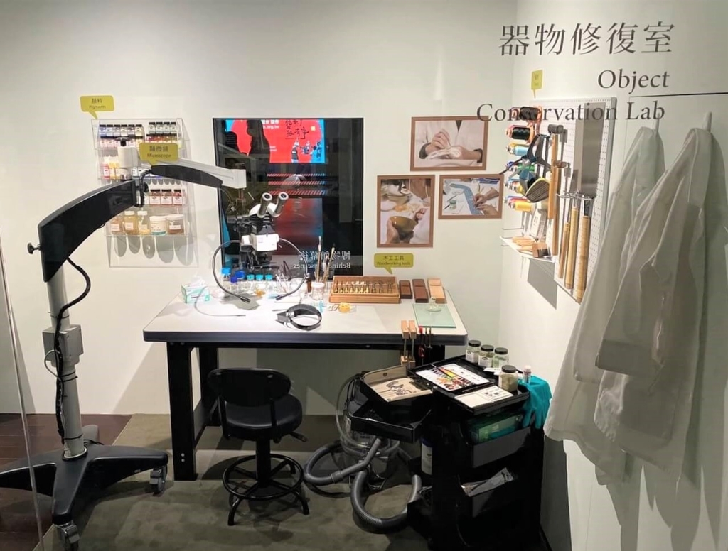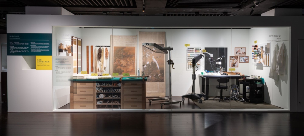 故宮作為世界級的大博物館,擁有近70萬件的典藏文物,紙張類占62萬左右,其他器物類型如銅、瓷、玉、珍玩等琳瑯滿目,年代跨度數千年。登錄保存處處長岩素芬介紹,為了守護這些珍貴的人類文明資產,故宮於民國59年(1970)成立科技室,發展至今日由登錄保存處負責文物保存與修復工作,是全國唯一獨立文物保存修復部門,設置有書畫、古籍檔案、器物與織品四大類型修復室。本次展覽中也將書畫及器物修復室搬到展廳內,讓民眾有機會近距離了解隱身在文物背後的功臣「修復師」日常的工作環境。