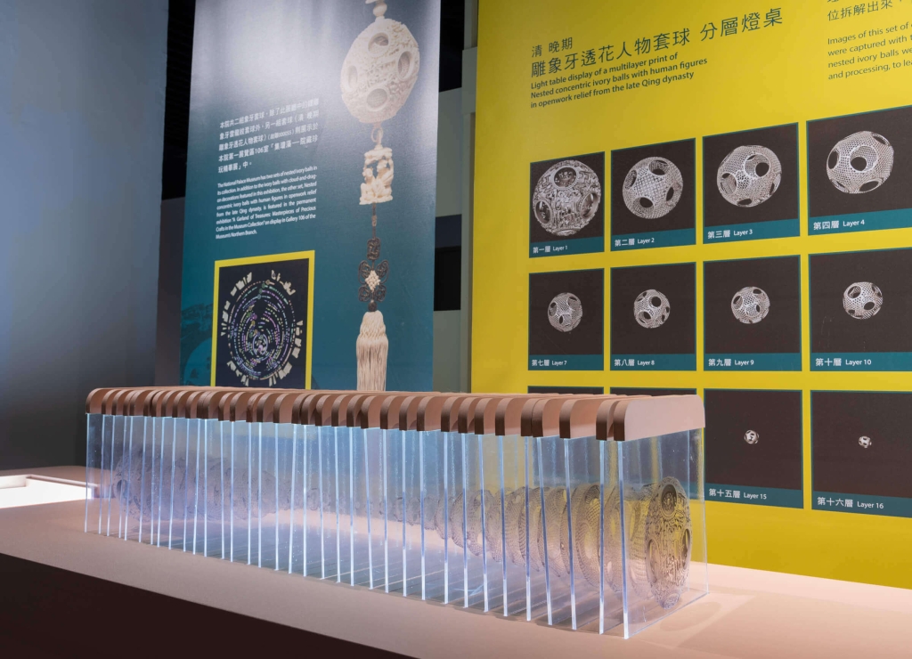 透過現代科技掃描技術,可以了解文物的內部結構、材料與製作技術等,進一步修正過去的研究結果。例如,清十九〈鏤雕象牙雲龍套球〉,直徑約12公分,依過去紀錄,此象牙球共24層,但經過最新的X光CT影像拍攝結果,重新確認共有23層。不僅如此,經過X光CT影像拍攝後,可再進行3D影像重建與處理,可將象牙球數位拆解開來,有助於人員研究象牙球的內部的雕刻工藝。