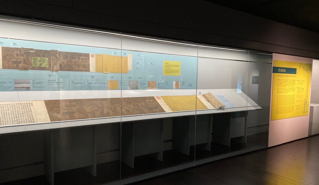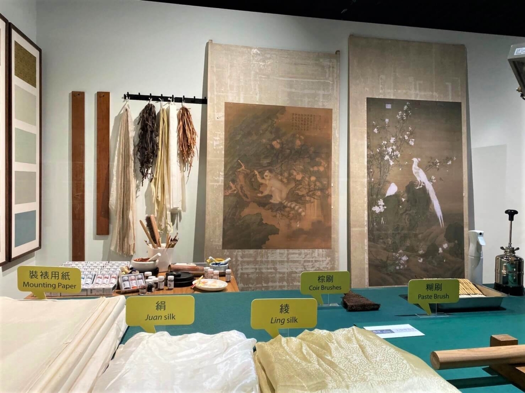 本區展示兩件絹本畫:傳宋劉松年〈十八學士圖卷〉與清郎世寧〈畫交阯果然軸〉。策展人登保處副研究員洪順興介紹,除因自然老化外,一部分受到繪畫材料處理與裝裱修復方法影響,因而造成劣化必須局部或全面揭裱修復。為保留最多的原始裝裱材質與歷史藝術訊息,修復師採用「最小干預」的方法與「可逆性」的材料,作為修復原則。