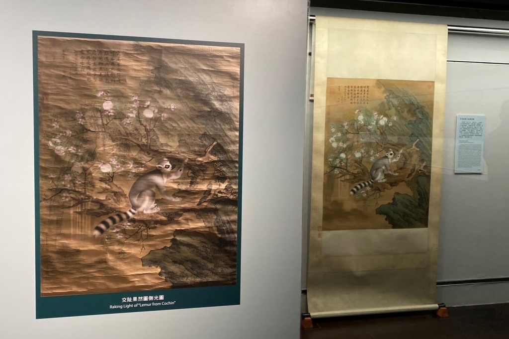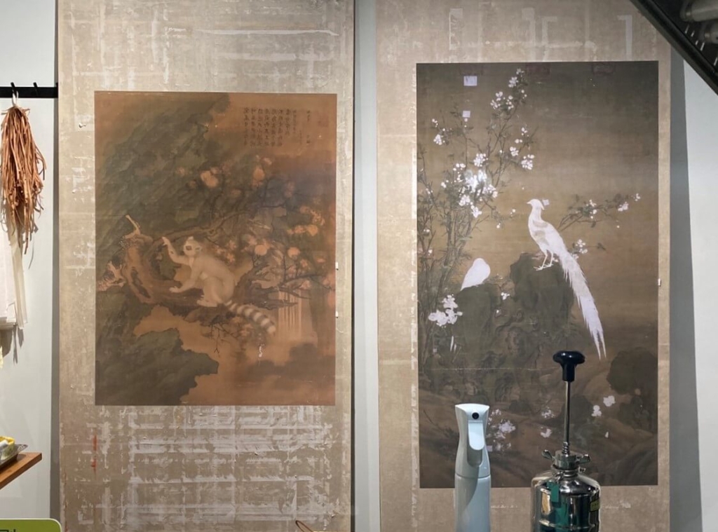 展廳的書畫修復室內,擺放義大利畫家郎時寧作品〈交阯果然〉和〈錦春圖〉的背面輸出圖。由於兩件作品皆由洪順興負責修復,他揭開裝裱後,發現〈錦春圖〉畫絹背面二隻錦雞和部分花卉的位置,畫家有先在背面網目塗上白粉。因此,當正面彩繪時,即使用彩顏料輕薄不厚重,但顏色依舊鮮豔細膩。但同為郎世寧創作的〈交阯果然〉背面卻沒有敷白粉,顯示畫家在創作時想法多變,並沒有一定的規則或方法可循。比較兩者的保存情形,〈交阯果然〉的白色顏料脫落很多,由於清宮的絹較厚,因此也較容易脆化產生摺痕。