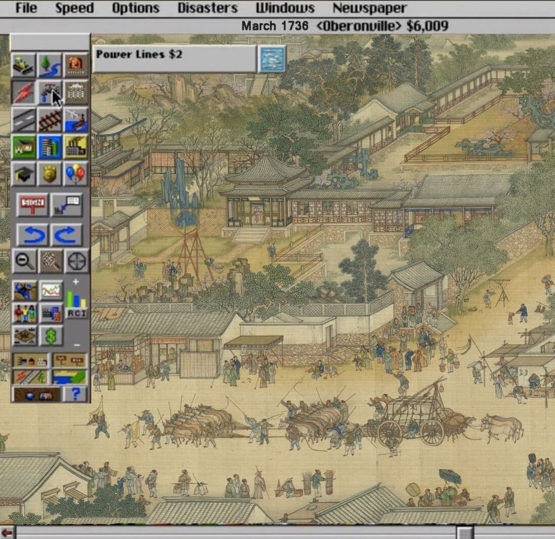 打造心中理想的虛擬城市,並非現代人的專利。中國古代最知名的「模擬城市」玩家,是出身於北宋徽宗朝的宮廷畫家──張擇端。他以生活在首都汴京城中的人、事、物為靈感,圖繪出世人耳熟能詳的〈清明上河圖〉。此一描繪河岸城市的傳奇題材現世後,引起後人不斷傳抄,紛紛加入手繪版「模擬城市」的繪製。多數玩家在北宋汴京城的地貌基礎上,增添自己對於理想城市的規劃與塑造。為了向前輩玩家張擇端致敬,或意圖仿冒,後世玩家多將自己規劃的河岸城市也命名為〈清明上河圖〉。不同時代的社會風俗民情,隨著不同時期創作的〈清明上河圖〉展現在今人面前。