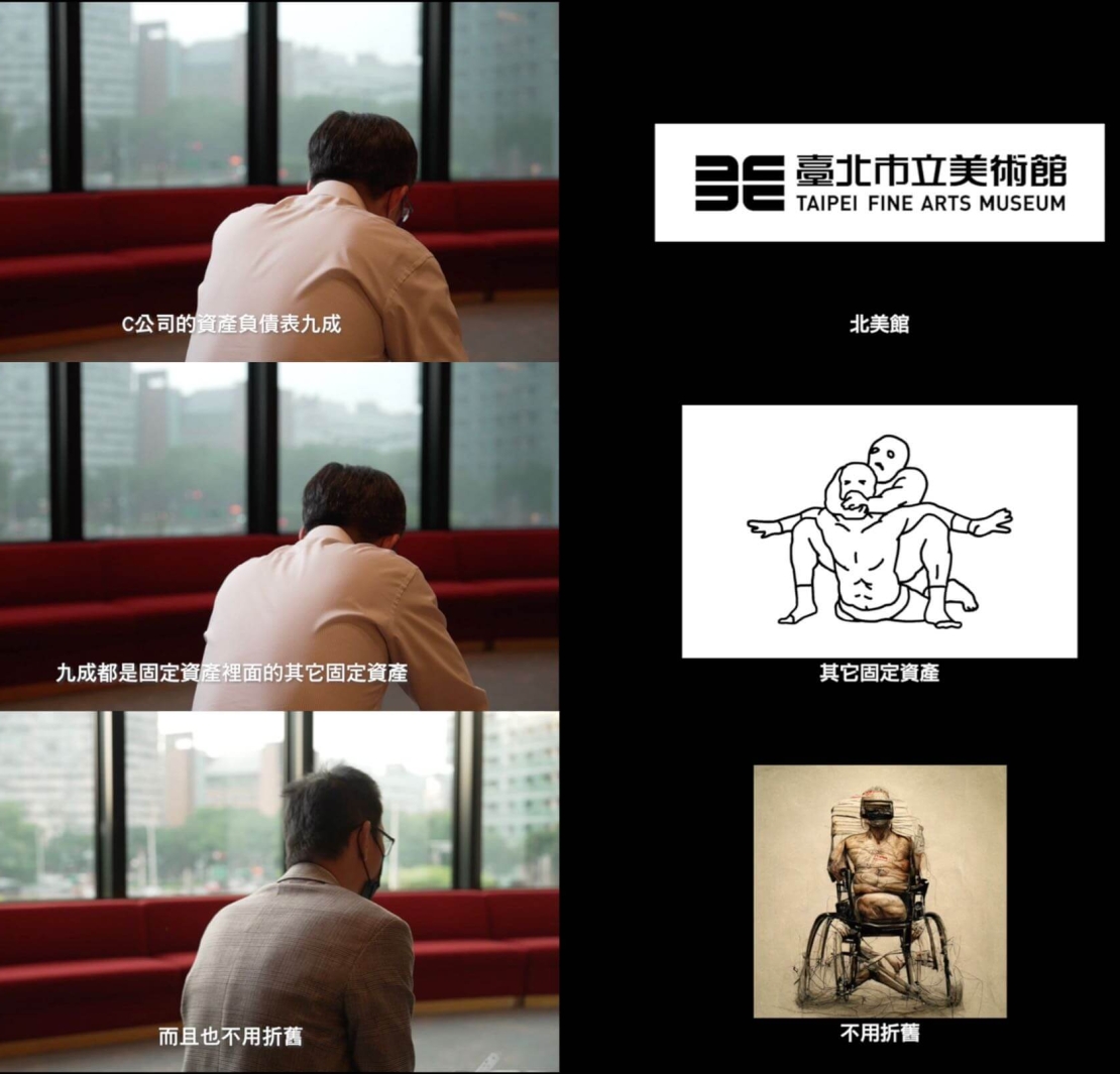 更有甚者,崔廣宇貼心地在相關分析數據附上了台積電作為對照組。值得注意的是,台積電並非是傳統藝文左翼最喜歡批判的福特汽車式工業而是以創新技術與價值創造為主的後福特工業,千萬記得張忠謀先生曾強調台積電是服務業而非製造業(註10)。更有甚者台積電創立於1987年,而北美館成立於1983年、國美館成立於1988年,高美館成立於1994年,其創立時間相當於台灣藝術進入美術館的時間,數十年過後台積電對於科技業的影響力顯然不可同日而語…,恰是在此高度專業性的偏執狂批判中,讓《2022大台灣上市上櫃藝術株式會社暨文化價值生產力分析》產生了反映真實現實的作用,作品雖並非就其單位真實報表的分析,是經過藝術手法與藝術目的處理的「作品」,但我們仍能從作品中嗅到藝術家對於美術館財務運用的警示。