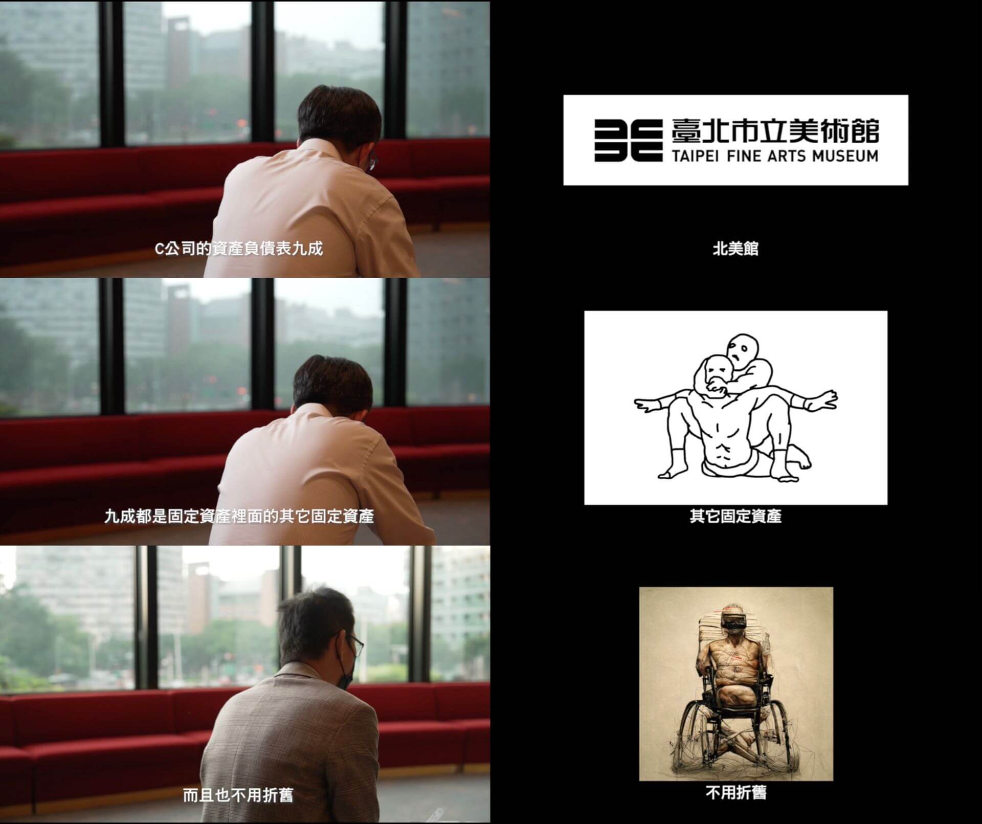 在這個創作聲明中,可以清楚地看見崔廣宇執拗並且專業、精準地邀請財金會計專業人士,將台灣各館舍的財經報表「故意」經過「科目改造」的調校,使其趨近一般營利公司財報狀態,並進行了一次數字分析。通過這樣金融、財務的無偏見分析,那些所謂的藝術館舍所象徵神聖性、美學高度、藝術價值乃至於社會意義…等等,高大上、偉光正的修辭,全部失效只剩下殘酷地卻也平等地資本主義自由市場競爭的存活邏輯。