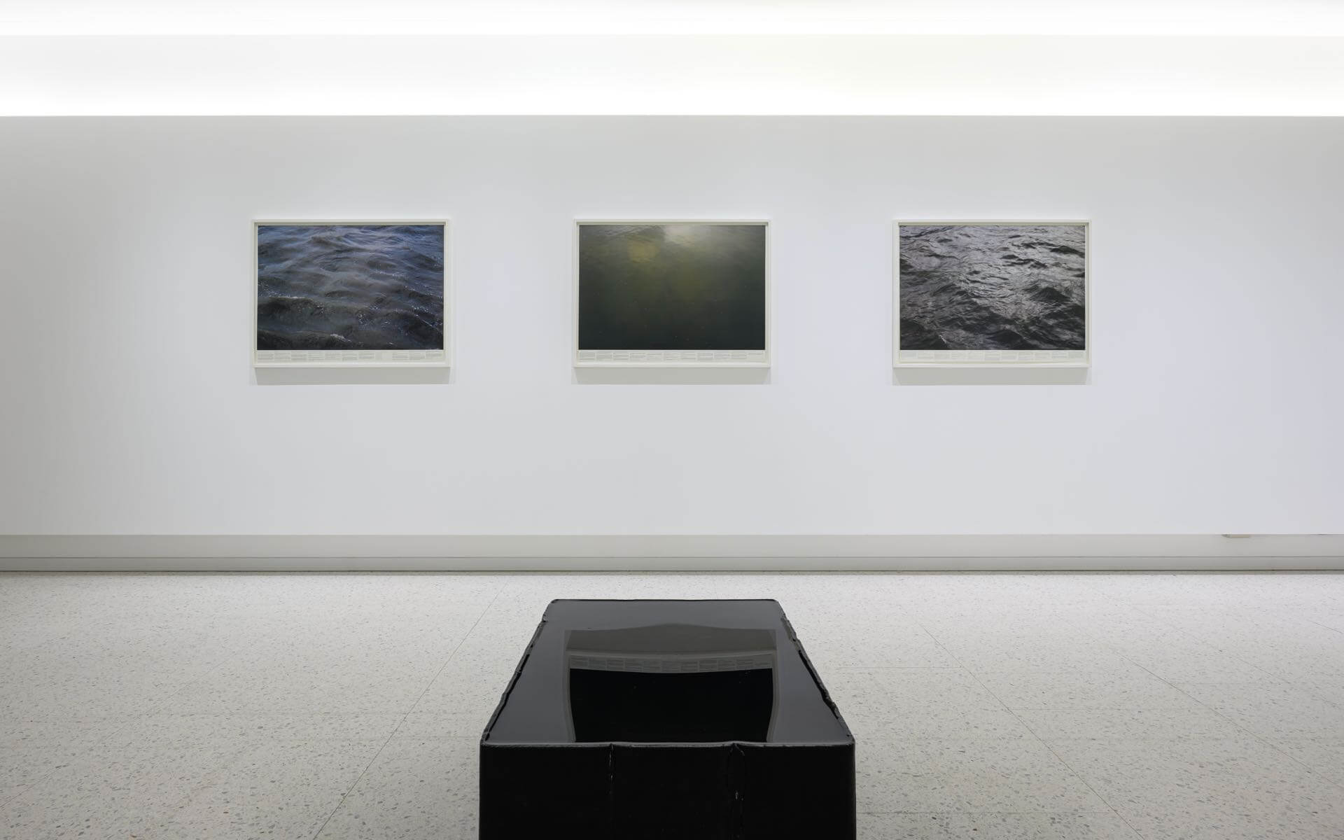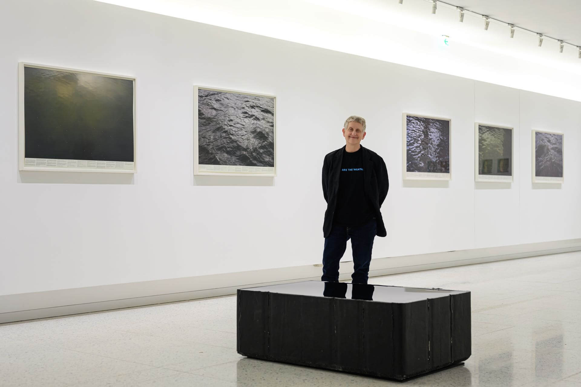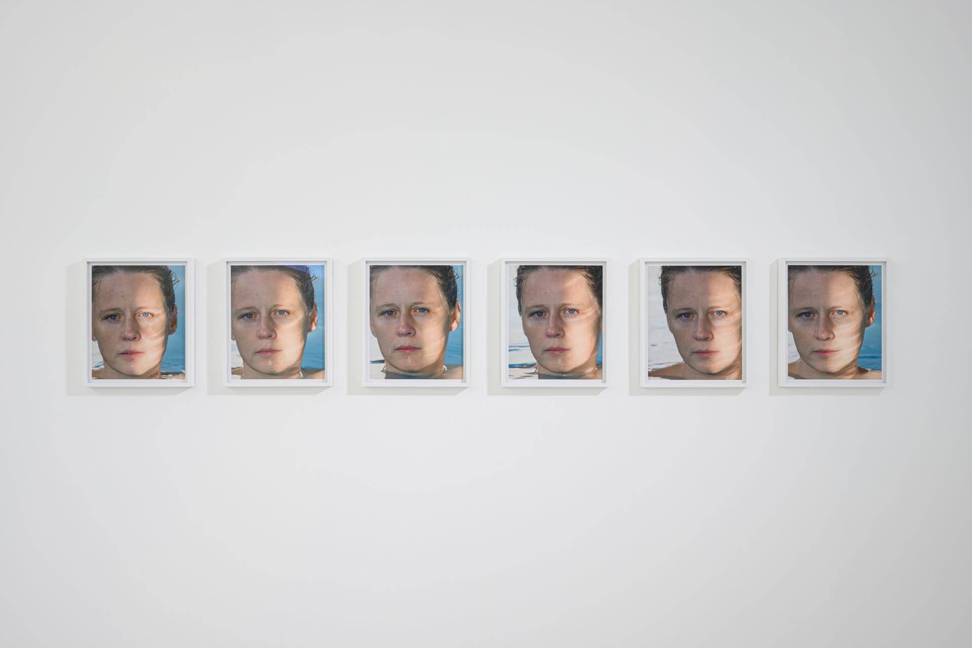 葉曉甄接著點出羅尼‧霍恩的作品時常呈現「水」不同的質地,像是玻璃雕塑外觀上看起來像是一墰清澈透明的水,這次展出的《Still Water(The River Thames, for Example)》亦是一系列泰晤士河水波的攝影平版畫。從作品我們可以看到縱使只是一個小的影像局部,河水紋理與顏色卻有極大的變化,羅尼‧霍恩會在水的影像上標示數字,數字會對應到畫面下方關於文學、電影、詩句的引用,像是一種對影像的註腳,不過卻破除文體中註腳既定的邏輯連動,帶給觀者像是蒙太奇般無限又私密的對應連結。另一攝影連作《Untitled(Weather)》羅尼‧霍恩拍攝一名女人在冰島各地溫泉與泳池的情景,影像呈現水波與光影的細緻變化,這系列攝影的六張照片乍看之下會誤以為是重複的影像,但仔細觀察後,發現光影與模特兒的神情皆有細緻差異,影像捕捉的是不同階段的時間,也反映了周圍不停流動的環境。