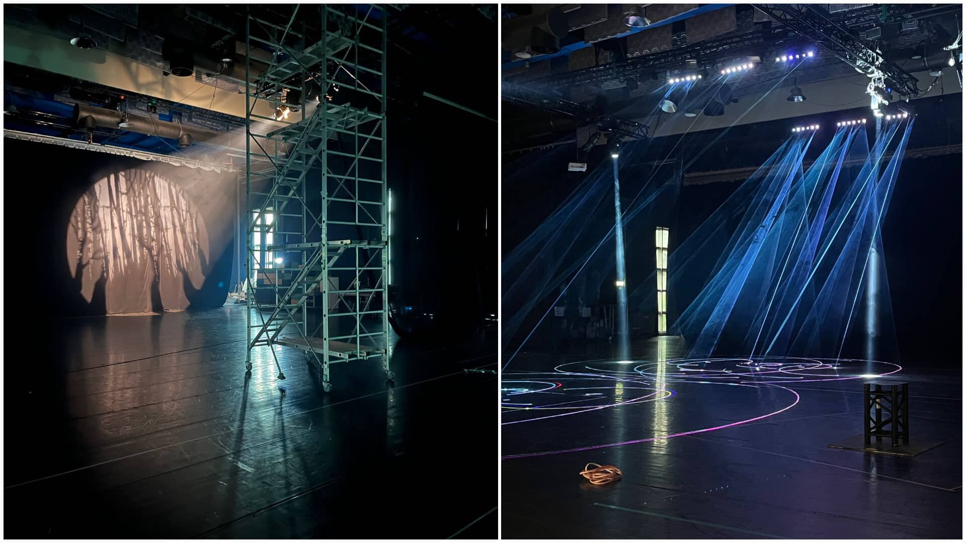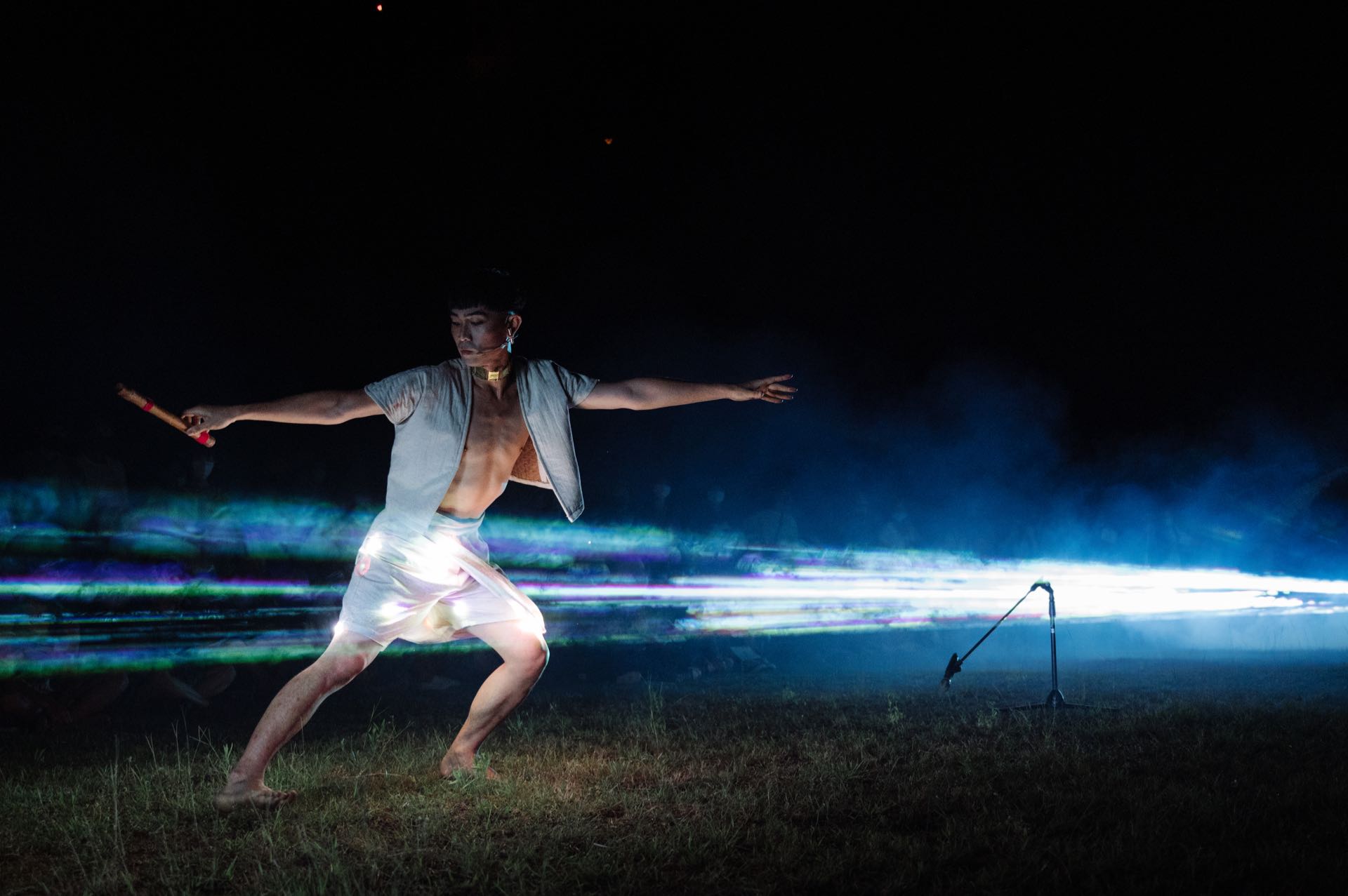 東:我覺得我會認同淑麗說用科技、把它導向一個科技劇場的形式,並找了藝術家張方禹來做雷射,有幾個很重要的原因。第一個原因是我覺得「靈界」像是夢境,它是一種……可以被想像、可以是真實被經歷、卻又是不可碰、不可見的,所以我覺得雷射某種程度就有點像是這個樣子。2022年在銅門部落的演出中我認為最成功的橋段是「靈橋」,我們當時用許多雷射光束打造一座橋,當靈橋出現的時候,部落的族人是很震撼的,他們覺得那個橋就是夢裡面的樣子,雷射光科技呈現了靈界空間。第二個覺得對的原因是,用雷射光呈現的狀態我覺得跟神話迷離的狀態——比如說睡覺入夢——這個語彙是對的,再來就是的確也蠻少原住民的創作者會比較願意嘗試用新的東西。