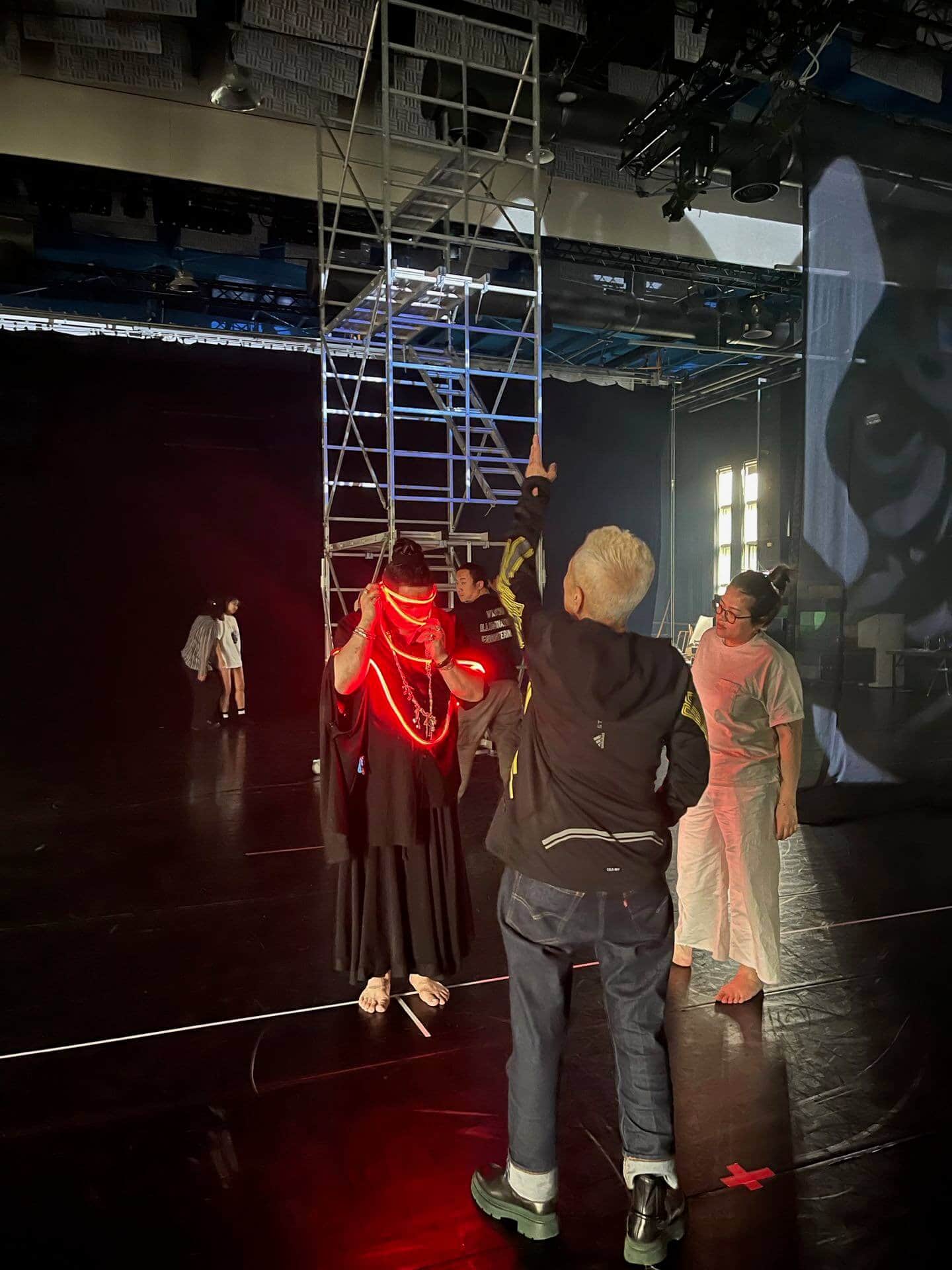鄭:原則上是東冬寫的劇本,他也是藝術總監,但因為有太多技術需要發展和精準確認,最後這個劇場版我來擔任導演的角色,對文本進行再詮釋。不過每一個細節還是要回到東冬來證實沒有問題,每一個步驟我們都很小心處理,尤其我從一個非原住民的角度切入,一個漢族怎麼跟原住民合作?就像我在國外一樣,我在國外算是少數民族,又是酷兒、又是女性、又是亞洲,現在又加上年紀大!我們在白人的機構做事,他們有些時候會把你當成一個token(標誌),所以我對種族歧視其實是很有親身體驗的。尤其這次跟原住民合作的過程,我們雖然強調要把技術帶進來這個作品,但不是說要炫耀我有什麼高科技、5G之類的,這些對我來講都不重要,而且我反對崇尚高科技。我會強調的是技術跟文本之間的表現精神一定要很融合,我每一個技術的使用都會是從概念出發,所以就像是東冬講的,我覺得我們的雷射真的很沉浸啊!