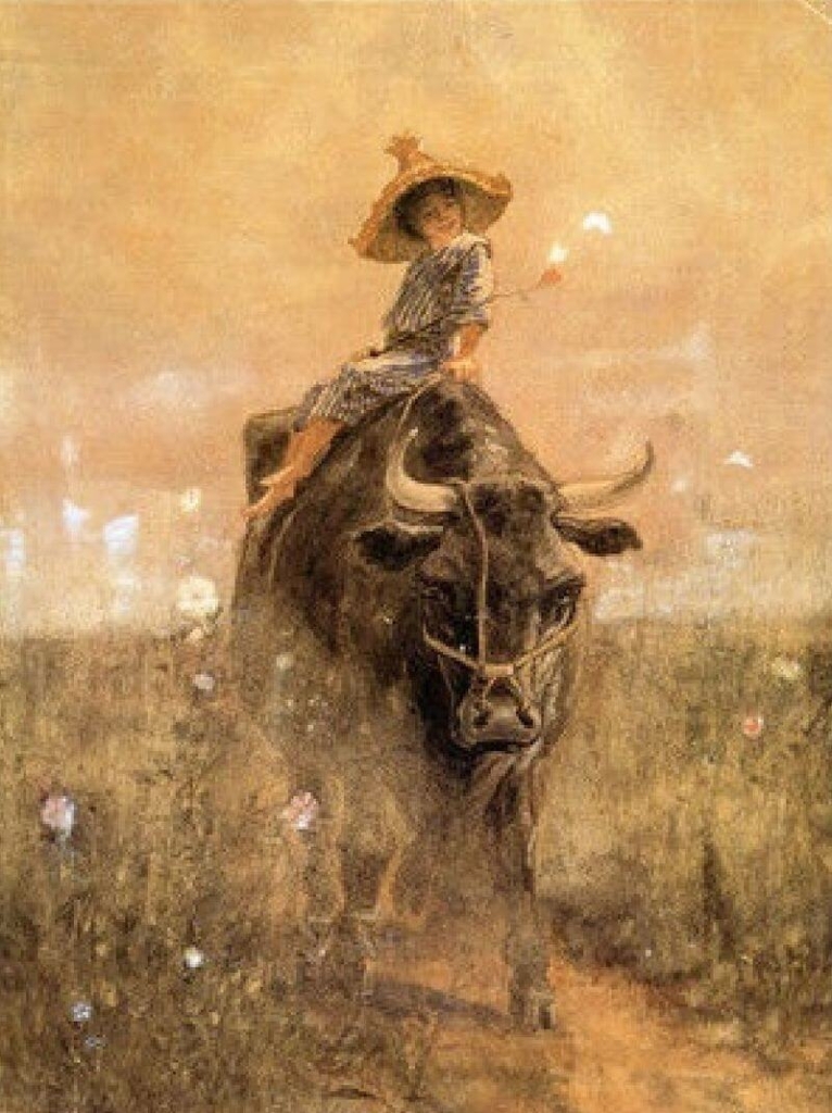 之後台北州廳委託黃土水製作獻給昭和天皇的〈歸途〉(1928,宮內廳三之丸尚藏館),進一步將田園牧歌主題中常見的牧人角色隱去。根據作品附上的文書,可以得知此作藉由中國古籍《尚書》:「放牛于桃林之野,示天下弗服」典故,傳遞天下太平的寓意。