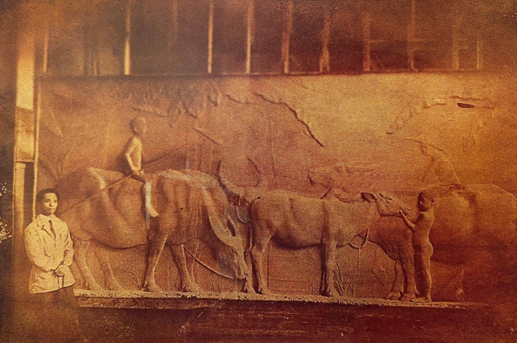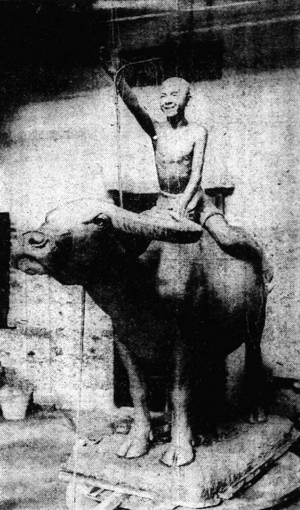 事實上,就在黃土水寫下上述文字的隔年,他完成了〈水牛與牧童〉。從當時的報紙照片可以看到,這是具有表現出田園牧歌般帶有優美、天真氣息的雕塑,呼應上述文章的內容。他以附近的小孩為模特兒,但小孩卻沒什麼表情,只能自己添加想像創造,營造牧童愉快嬉鬧、自在無慮的情緒。