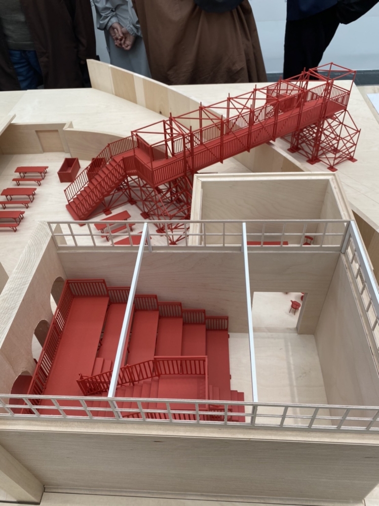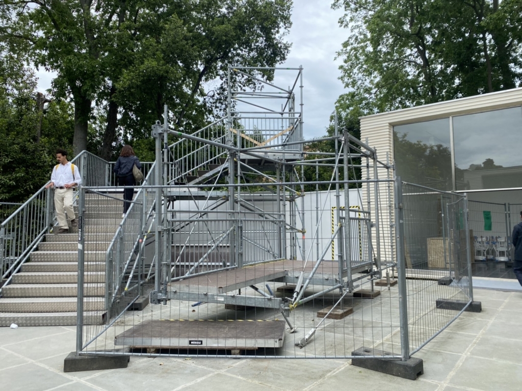 奧地利館相當激進地提出一種社會實驗性的方案,名為「參與」(Beteiligung / Partecipazione),既指涉奧地利館長期參與威尼斯建築雙年展,也直接關聯到作為這次核心的空間行動:由維也納的建築團體AKT和建築師赫爾曼·捷克(Hermann Czech)策劃,奧地利館試圖在館舍建築後方搭建一條連結一牆之隔的在地社區的「空中通道」,讓當地居民得以自由(也即免費)地進出奧地利館(當然也會包括整個綠園城堡展區)。這一提案最終被大會否決,因此我們在現場看到的是一座顯然未完工的封閉的空中走廊,以及從中體會到的,奧地利館試圖透過改變空間來推行新的共存或生活方案的批判性思考與實踐。而最終未能完全實施的策展思路,是否也暗示了雙年展這樣大型展演即便在觀念上可以很激進,卻終究在實踐中有相當大的局限?