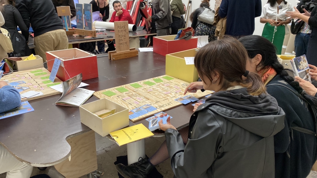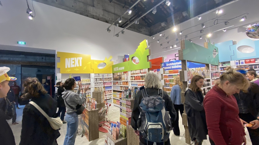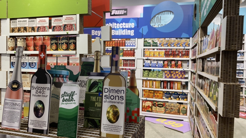 人潮湧動的拉脫維亞館,在雙年展與超市之間、在各國家館與販售的不同商品之間,建立起視覺化與隱喻性的關聯。貨架林立的超市中,近十屆威尼斯建築雙年展中各國家館在不同年份中提出的主題,化身為以不同國家代表性產品為視覺化呈現之物。同時更設計有以丟擲小球進入相應貨架上方設置的網袋這樣的「票選」環節,旨在讓觀眾體會到自己身為民眾的認同感與作出的決定,是如何與整個社會的運作之間互相影響。這是一個從觀念到結構設計、視覺呈現和互動性都作了充分思考規劃的展館,遺憾的是或許因為互動性太強而吸引大量參觀人潮來進行丟擲球的遊戲,熱鬧之餘,反而有削弱對其策展觀念之充分體會與認知的疑慮。