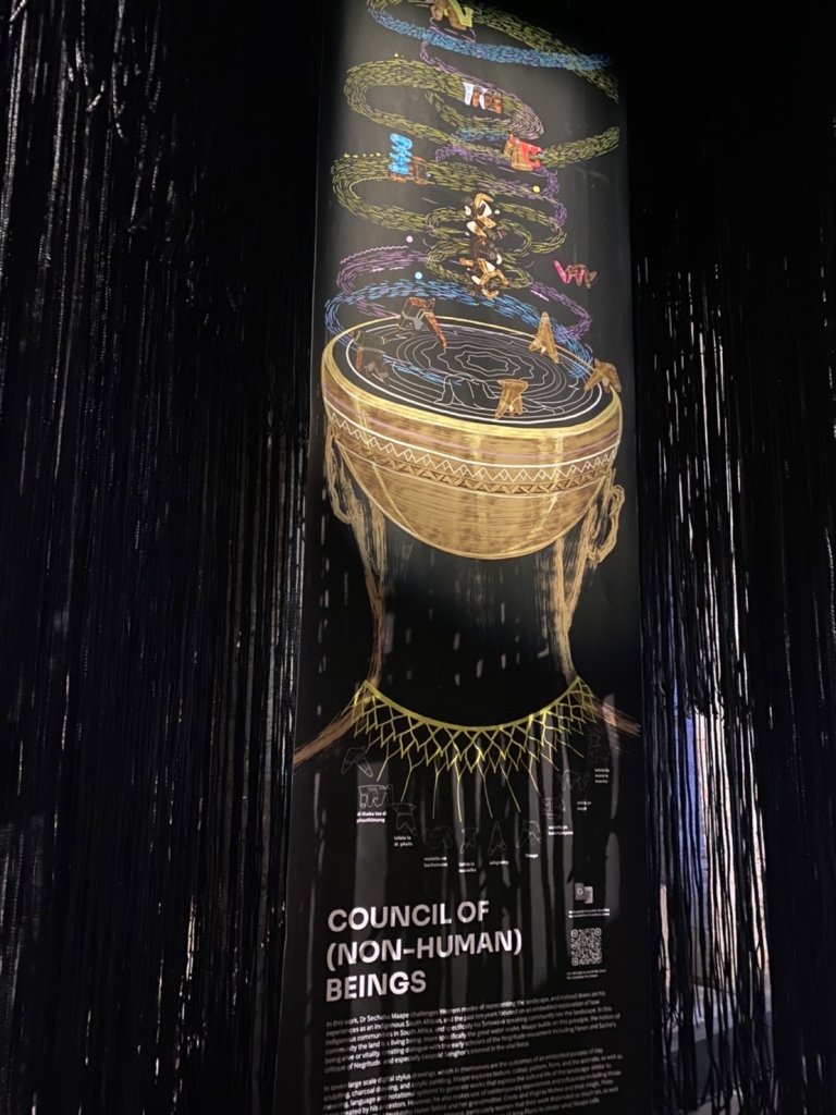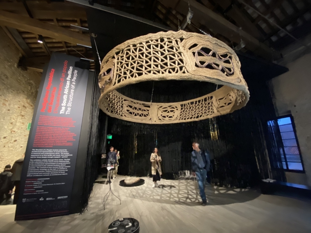 南非館以神秘低調的空間佈局,鋪陳一個幽微卻宏大的敘事,展呈上並不像是主展題「一個民族的結構」(The Structure of A People)那樣具備全然理性化的邏輯脈絡,以黑色條狀簾為主要空間動線引導和區域分隔的介質,似乎隱喻不同思維方式、不同課題範疇之間彼此滲透的關係,條狀簾本身可隨意穿梭的性質,也暗示了某種非線性的思考邏輯。南非館具體的展呈物,則明確回應了「過去是未來的實驗室」(The Past is the Laboratory of the Future)、「非人物種的議會」(The Council of Non-Human Beings)和「政治動物」(Political Animals)這三個展題,或以檔案呈現南非前殖民時期建築,或以迷人的巨幅繪畫表現泛靈論世界觀的建築性結構,或以思路各異的建築模型裝置表現南非的建築學校校舍,彷彿都被包裹在同一具有機身體內被觀眾所認知,細節上的豐富層次與整體的完成度都相當具水準。