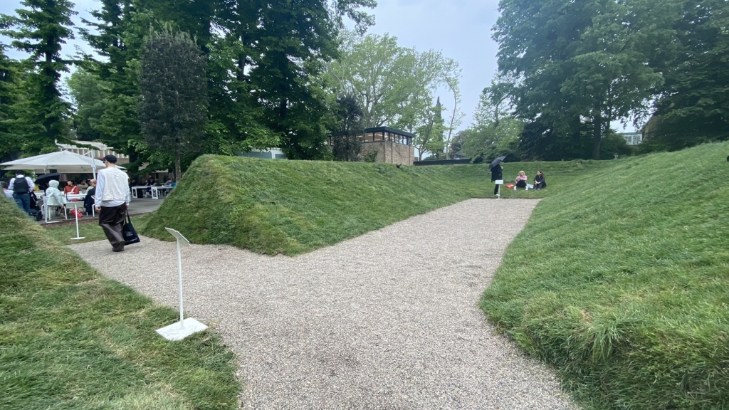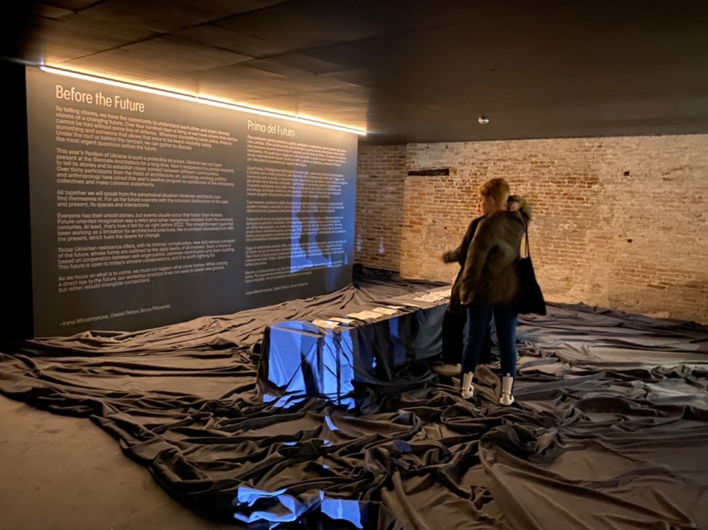 烏克蘭出現在國際大型展演中,本身便是帶有複雜議題之代表性與話題聚焦性的存在。本屆雙年展在綠園城堡和軍械庫兩個主展區皆為烏克蘭闢有展館,前者在戶外呈現為覆蓋綠植的防禦土牆(在威尼斯成為觀眾的休憩空間),後者則在室內似防空洞般營造昏暗、低矮、陰鬱的氛圍。現場並無實質性的展呈物,而以象徵性的身體感和簡約的提示,完成不失後勁的展示。
