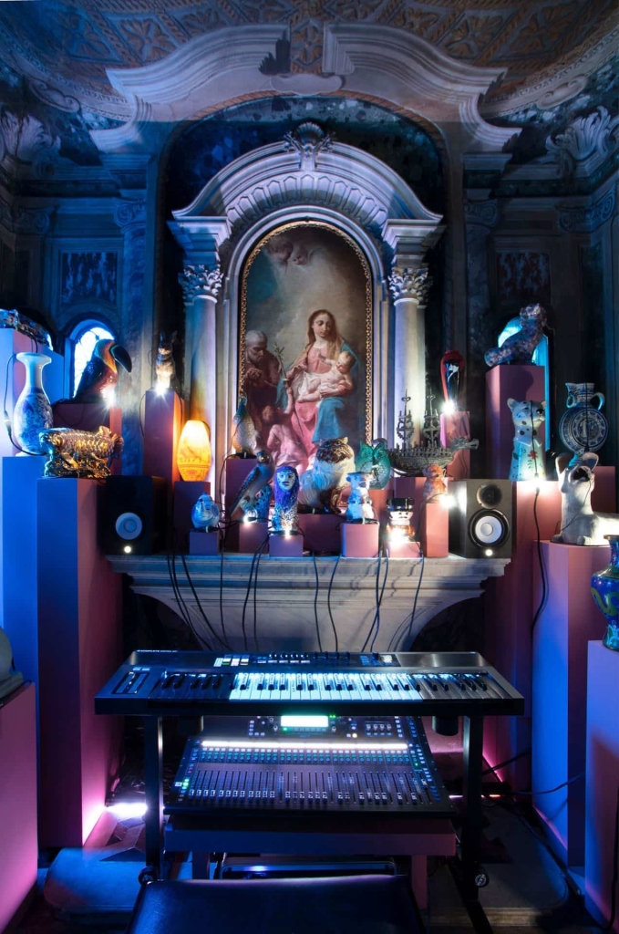 從建築展延至音聲,再從音聲還返至幾何,藝術家的想像隨著幾何維度的展延漫向時間,歷史成為了「場域」那不可測、不可感只能抽象性理解的維度,藝術家如是說到:「我們可以創造出世界上最現代的音樂,但他們仍然使用的是人類數千年來一直在使用的相同工具,例如共鳴、諧波、和聲以及人聲。如果你進入一個2000年前的空間,它現在仍然唱著與2000年前一樣的音符…場地本身就像是表演中的一個角色⋯伊斯坦堡的古老浴室、維多利亞時期的地下通道、威尼斯的巴洛克小教堂⋯⋯。」在時間這個不可見的維度裡,抽象的聲之形伴隨著可聽聞、可觀看的臨場,層層疊加於觀者的感性思維與意識上,於是威尼斯那泛著藍色幽光的迷你教堂與其音聲,讓我們體會了作品《眾神》(Little Gods)的基督教歷史,那曾經微小不足道的信仰最後漫流成西方文明裡銘刻的基因。