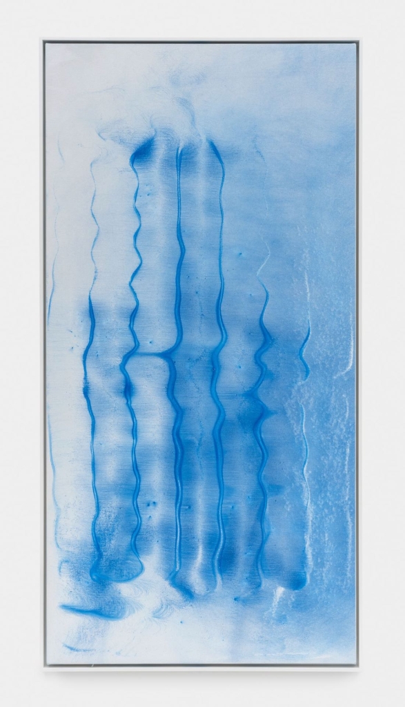 相較於場域、行為與雕塑裝置等創作,以現場的「音聲」作為貫串時間維度的感性元素,其「共振繪畫」(resonance)與「重組」(Recomposition)系列,則是藝術家在作品必然地「寂靜」狀態中,思考「音聲」的具體實踐。從有聲的「音聲」到無聲的「音聲」,康丁斯基將「音聲」從聽學感知的實在轉化為推想的抽象觀念。相較於百年前的前輩康丁斯基知名的「構成(作曲)」(compositions)系列,(註3)其主要是以自由奔放的模式掙脫古典的嚴謹與僵化,比爾的作品恰恰是依賴「作者」在電子設備上的嚴謹操作與認識,才可能實現的自由與奔放。畫面上那深具動感的藍色,乃是將音箱放置於畫布下方,使粉末顏色自由地跳躍、升降,並在特定的瞬間降落在畫布上靜止、留駐。音樂的繪畫性在康丁斯基的實踐裡是一個藉由身體及筆觸去模仿的想像,然而,比爾真正地實現了讓音樂為自身作畫。無聲裡,那充滿躍動性的色彩與線條蘊含著真實的音樂;「聲之形」在「共振繪畫」系列中,展露自身。