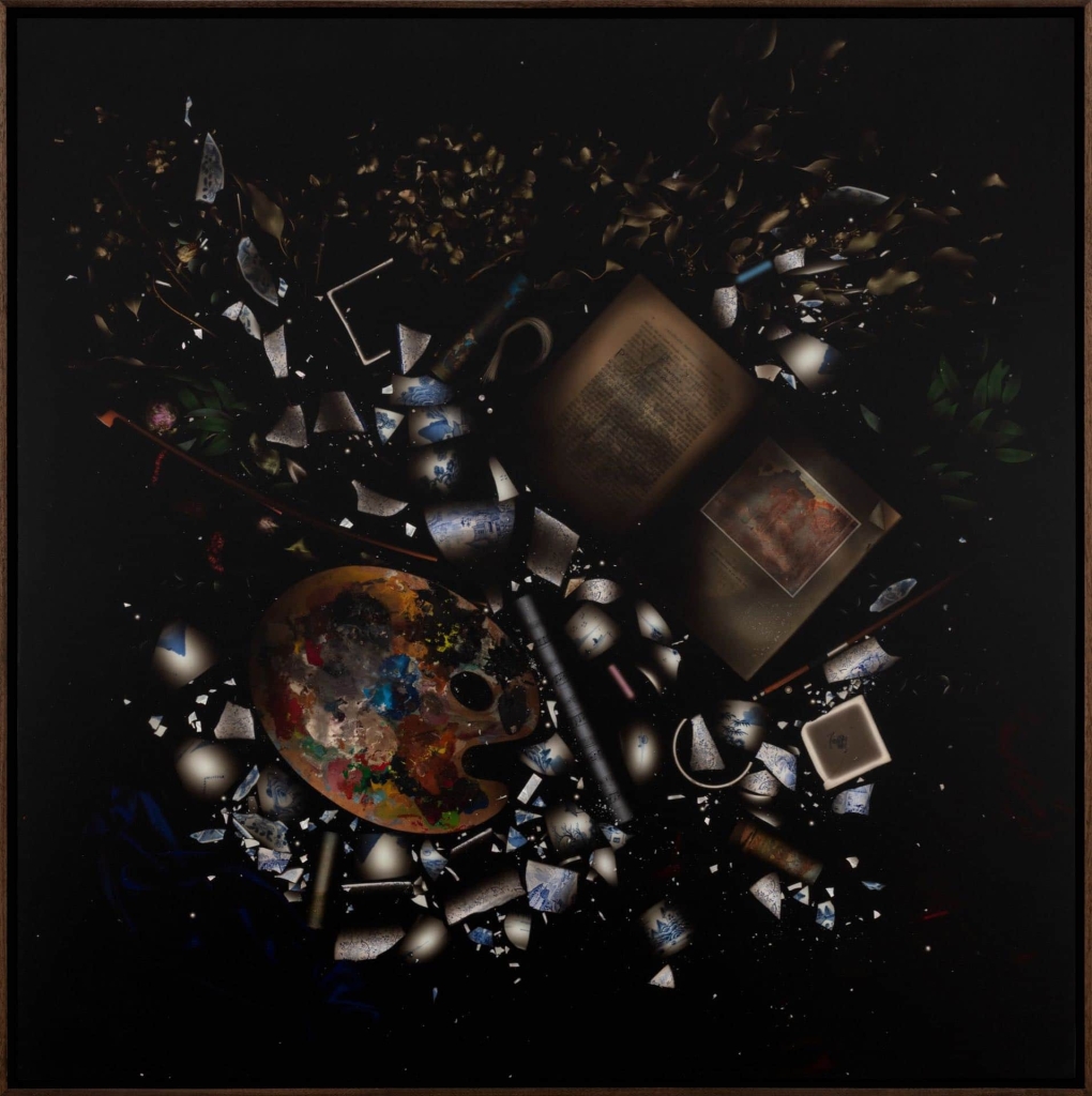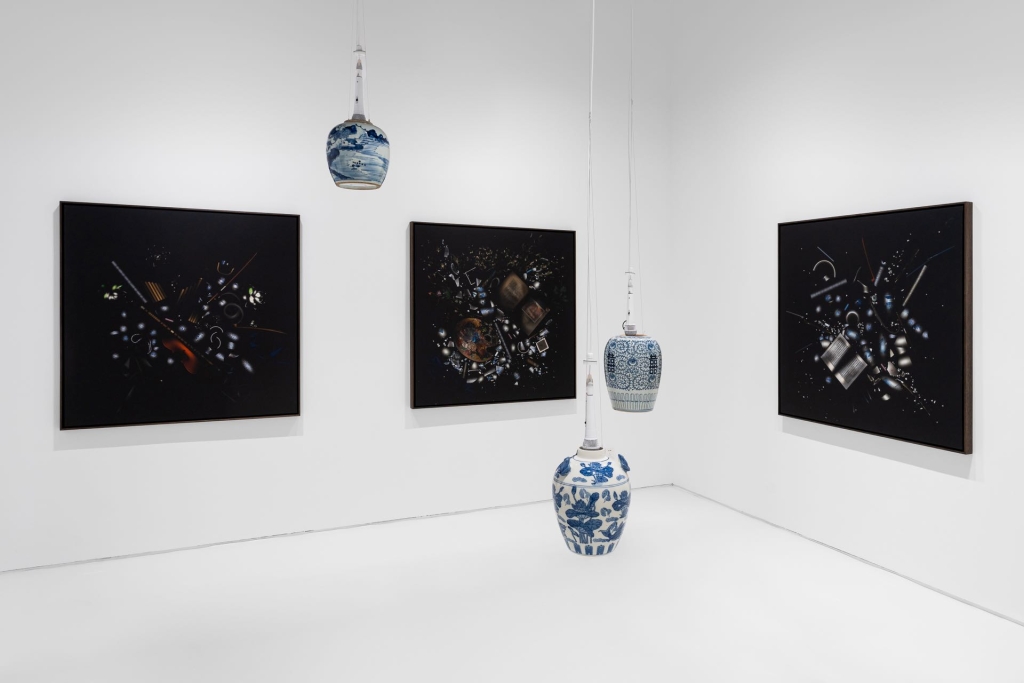 如果說「共振繪畫」系列以可感知的「音聲」去實現了「聲之形」的展現,那麼比爾近來於阿爾敏.萊希–上海(Almine Rech)畫廊推出的首次個展「重組:夜宴」(Recompositions: Night Revels)與新系列「重組」,則嘗試以寂靜「樂器畫」來重探「無聲之聲」以及其繪畫形式上的可能。在此,藝術家再一次地探入時間(藝術歷史)的維度,通過搜集不同時代不同地點的藝術家其作品中包含樂器元素、青花瓷器等等的畫作,比爾將樂器物件拆解,並重構成宛若康丁斯基的構圖形式。那拆解或者碎裂的樂器圖像,喚起了某種聲音的在場暗示。「無聲亦聲」的形式表現,讓「音聲」從而成為了抽象概念性的存在,「形式即音聲;音聲亦形式」。而碎裂的青花瓷,則投射了音樂與文化交流的源遠流長。在比爾看來:如果我們追究歷史,便會發現青花瓷經歷了商業和帝國主義的傳播,讓它在16世紀時第一次出現在貝利尼(Giovanni Bellini)的畫作中,進入西方藝術史。不斷追溯下,也會發現它最早出現在美索不達米亞和伊朗,他們首次想到使用氧化鈷來製造此種藍白。「追蹤這種顏色的故事,就是在追蹤文化交流的故事。」「重組」系列的每幅畫都參考了某件西方或中國藝術中的畫作,每一個交匯點,都是在闡述「這個指數級的文化交流與創造我們當代文化的故事」。