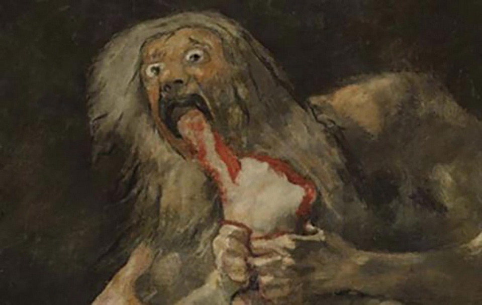 哥雅《薩騰吞噬自己的兒子》,約1819-1823,油彩壁畫轉到畫布,143×81 cm,西班牙馬德里美術館。