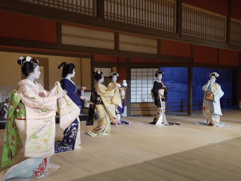 第四幕「祇園祭祝鷹山」代表夏季,而第七幕「茶屋座敷雪見舞」則展現了冬季雪夜茶屋的景致。這兩個場景尤其強調藝妓和舞妓之間的合作,並涉及室內外場景的變換。從門前的招呼到室內的起舞,藝妓和舞妓都必須隨之調整衣擺裙長和行走姿態,在在皆是日常磨練的功夫。在第七幕中還加入了藝妓的獨舞段落,劇場的魔力讓觀眾仿佛置身於知名茶屋「一力亭」的包廂中,可以近距離欣賞藝妓和舞妓在茶屋內精彩的表演,這對於一般因茶屋不接生客而不得其門而入的觀眾,可藉此一償宿願。