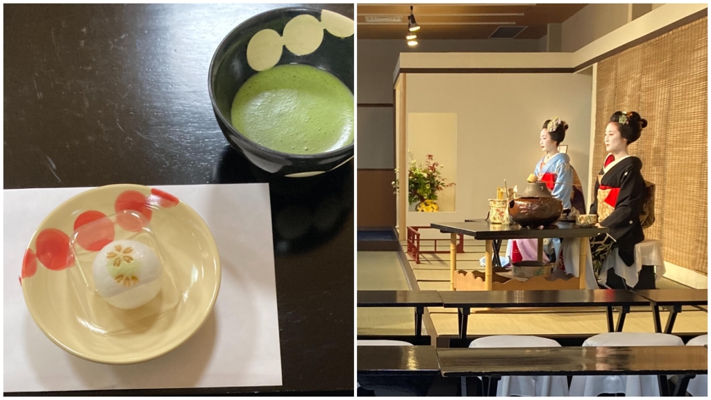 都踊單場演出票價為千元日幣起跳,若是一等席可以額外花費一千日圓,享受開演前的茶席體驗。茶席考量到外國人無法長時間正坐,採用同樣源於1872年京都博覽會,由茶道世家裏千家第十一代家元玄玄齋設計的立禮式茶席。茶席由舞妓負責點茶,以抹茶搭配名鋪製作的和菓子。盛裝和菓子的陶盤上裝飾竹串糰子花樣是都踊的代表標誌,用畢還能將其帶走作紀念。相比於舞妓包廂演出每人需分擔動輒數萬日圓的費用,都踊演出經濟實惠不少,場面也更為盛大壯觀,十分推薦。