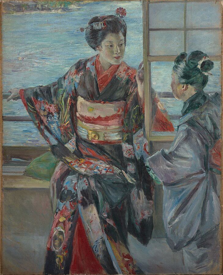自法國留學歸來的黑田清輝(1866–1924),來到京都後覺得自己重新發現日本,且不斷驚嘆於舞妓之美。1893年《舞妓》一作便是在歷經外國美學訓練的凝視下所完成。畫中描繪身著華服坐於窗邊的茶屋少女,斑斕的筆觸深刻表現波光粼粼的水面與和服布料的緞面質地,說是其外光派的代表作也不為過。黑田清輝的歷史畫作品《往事(昔語り)》中,也安插兩位舞妓做為其中人物,可由此見得舞妓在黑田清輝心中作為日本美學代表的重要份量。