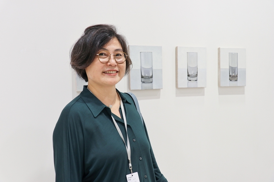 身為藝術史學者,研究範疇涵納韓國、日本、台灣和中國近現代藝術的韓國學者文貞姬博士,現為國立台南藝術大學(簡稱南藝大)藝術創作與理論研究所博士班的專任教授。她推薦的是彼得.德雷爾(Peter Dreher)的四幅小禎油畫。德雷爾是德國新表現主義大師安塞姆.基弗(Anselm Kiefer)的老師。文貞姬表示,我們鮮少在博覽會看到基弗的作品,但基弗也是一路從寫實逐漸走向表現主義。因此,從德雷爾的寫實作品中,我們除了從作品裡的細節,如杯中的影子、上方的數字所反射出的前後關係,感受到藝術家的個人思考,也可從中看到德國大學的藝術風格。同時,我們似乎也可以看見基弗的另一個創作面向,而非僅是由德國歷史、廢墟美學等面向去了解他,這些都是可以從作品中得到的有趣觀察,尤其是在藝博會這樣的場合中。
