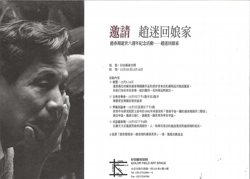 我曾在12月8日趙春翔忌日到善導寺送花致意;多次開車到苗栗探視卧病在床的趙春翔遺孀劉雪琴;更與趙迷討論作品細節,而電話熱線數小時。後來,我出版趙春翔傳記、舉辦「趙迷回娘家」、企劃趙春翔在中國大陸與台灣的展覽與學術討論會。但我沒有見過趙春翔,我覺得這種緣份,是神交。在他辭世28年後,我促成亞洲大學現代美術館舉辦的「遠方的行星-趙春翔藝術展」。這是情感發展的偶然, 也是藝術收藏與出版的外溢效應,更是華人藝術發展的必然。一位顛沛流離、走過烽火大時代、孜孜矻矻的藝術家,不該被遺忘、低估,或邊陲化。咀嚼趙春翔的人生境際,保守這樣藝術歷程,我彷彿為亞洲大學現代美術館的「遠方行星-趙春翔藝術展」提早了26年作準備。
