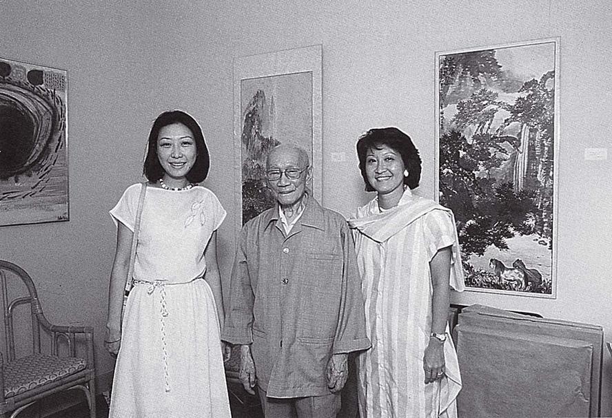 趙春翔於香港藝倡畫廊舉辦個展,林風眠(中)特地前來參觀。左為林風眠義女馮葉,右為畫廊負責人金董建平。(本刊資料室)