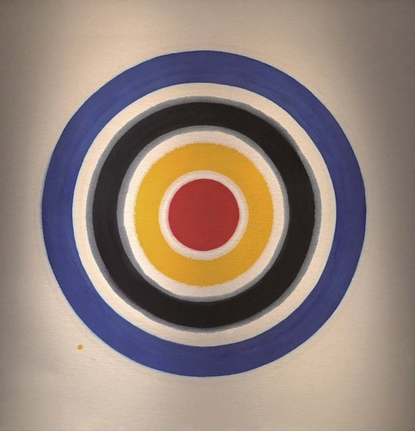 史帖拉作品中常見重複性的幾何形同心圓,迴繞的色塊與形體構成似量角器的形狀,據說是他在1960年代早期探訪中東城市而來的靈感。然而根據資料發現,美國藝術家肯尼斯.諾蘭(Kenneth Noland)更早使用同心圓,1958年的作品《起源》(Beginning),就是同心圓作品。趙春翔則在1963年,應顏料廠商之請試驗壓克力顏料,他將變型大嘴鳥與同心圓並置,比1967年才使用同心圓的史帖拉,早了四年。東方文化中的同心圓,源於八卦。八卦本質是動態的,不停變化旋轉。一旦將八卦圖快速旋轉,就會出現同心圓的視覺效果。而八卦、陰陽互動,來自於宇宙。由大宇宙來看,是天地萬物,而小宇宙論,則包含了君臣、夫妻、師生等人際互動變化盡含在其中。可以確定的是,宇宙萬物離不開同心圓,而來自同心圓的宇宙觀,正是空間的極大、極深、極遠化,也是潛意識行為,讓生命循環,生生不息,直達永恆。