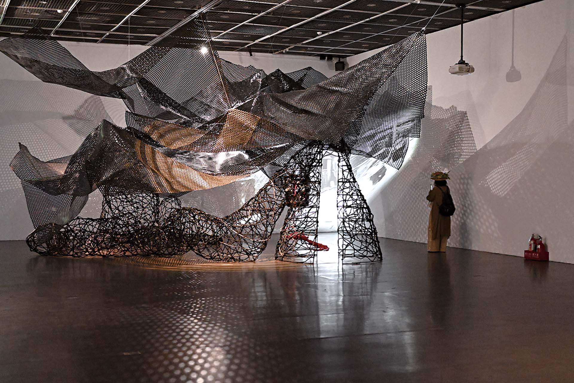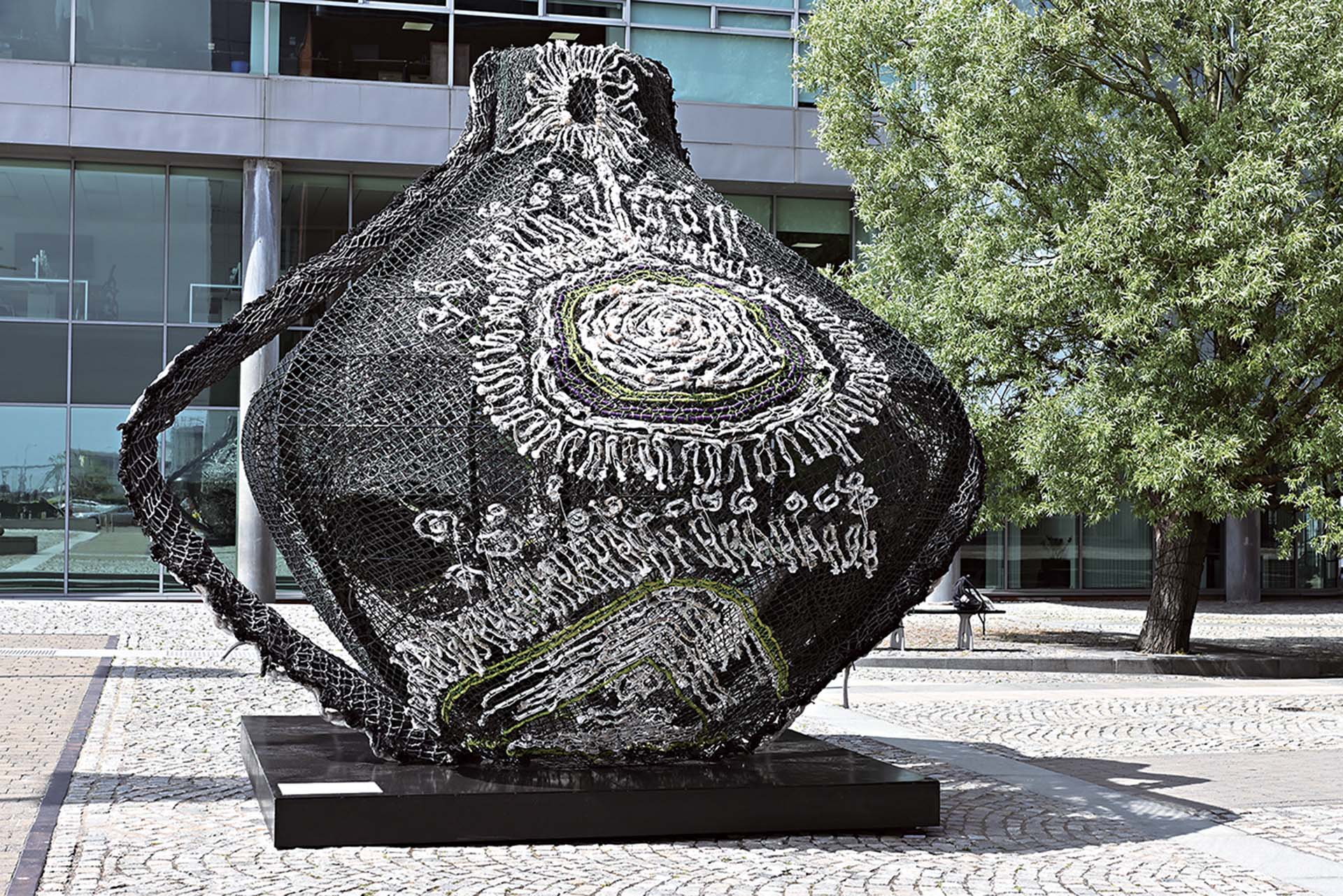 神聖陶壺上的海廢粗麻繩漁網被裁切成一段一段的,如海水浮動,又如海面陽光的放射狀。陶壺另一面,曲捲的粗獷繩索與細線纏繞,彷彿古陶壺的圖騰般,形成多重層次感。正如海廢材料,彷彿對應利物浦港口奴隸船的滄桑。此外,從上面看,有橡膠製成的一個個黑色有孔的小圈圈,這些橡膠沉甸甸的,串起來,成為一串串的像鉛錘的角色,似乎是幫助漁網沉到海底捕魚。這些比銅板大一些的橡膠小圈圈,經過海浪衝擊這一道歷程後,安聖惠把它們用線纏繞在漁網線編織上,最後,安裝在古陶壺鐵架上。安聖惠曾為了這些海廢著迷,而得到安慰與療癒。這些回收材料的物質性,就像是留下了利物浦奴隸船與海搏鬥的勇士疤痕,有一個麻繩圓型框中釣魷魚的餌,鮮綠色的鬚鬚長餌凸顯魷魚被釣起來時,魷魚身體不停扭曲翻滾的奮力掙扎,像是藝術家奮力創作的狀態與處境,呼應殖民意識的抵抗。換句話說,似乎這些海廢,從海裡退役的堆積材料,不管是沉甸甸的橡膠或是一段段的麻繩,它們在安聖惠的眼裡,都重新開始有了性格與靈魂。安聖惠的神聖陶壺,壺身四米二高,壺的底座有兩米,以及壺肚寬至四米。順著鐵製中間骨架,及其微微彎曲壺肚支架,撐開漁網上的編織。編織是講究結構的,但安聖惠又同時故意留下未經收尾的細線,與骨架支架交融成虛虛實實的現象。這些強悍的麻繩使編織的動作,卻又是充滿身體勞動的真切。