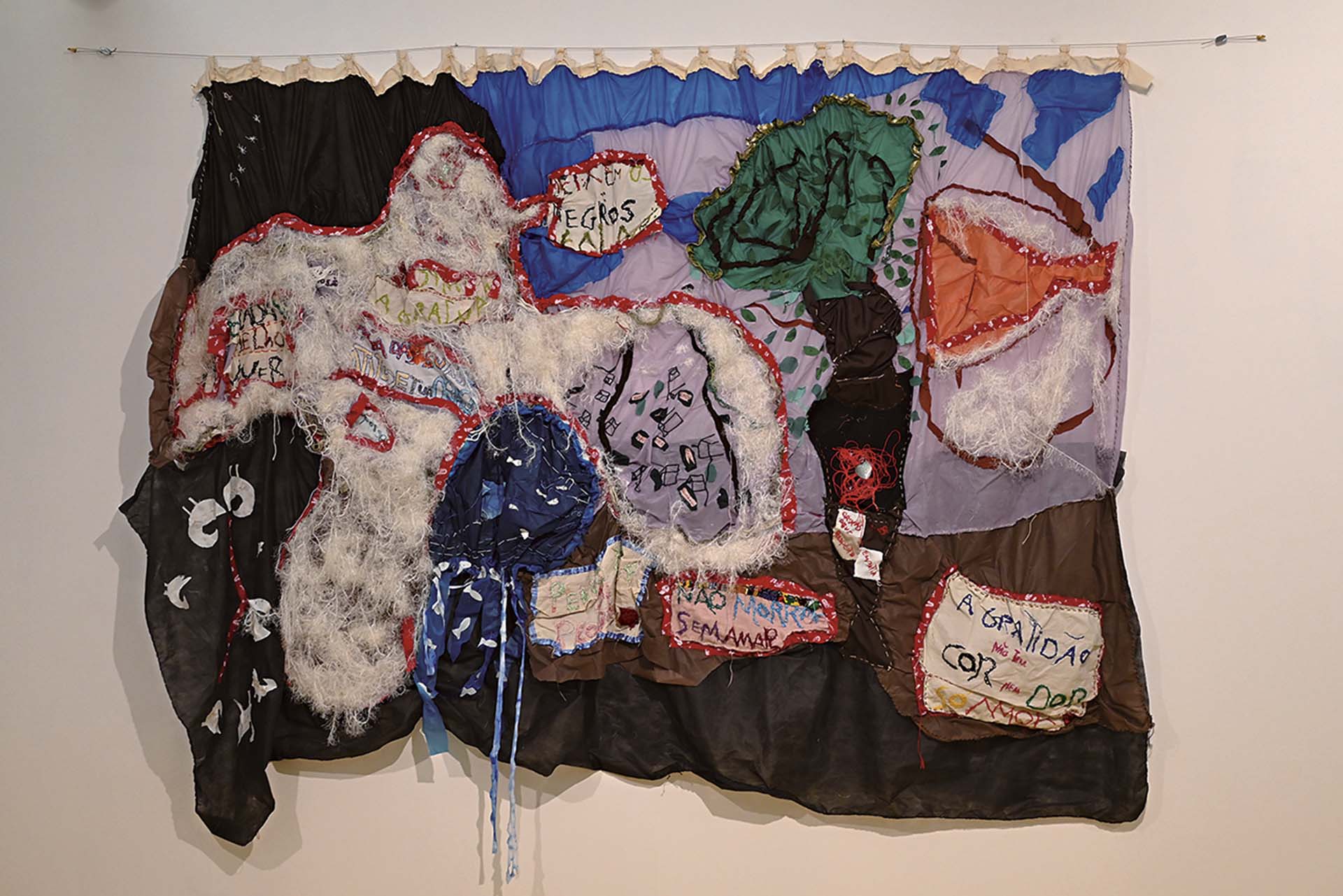 而巴西的藝術家伊莎.杜.羅斯里歐(Isa do Rosario)作品《歐閃》(2022-2023),其名字是指非洲藝術聖地約魯巴的掌管治療之神。她有天主教家庭背景,14歲以後,開始以靈性經驗為創作靈感,直至她現在為老祖母的身分,使得她創作渾然天成。羅斯里歐作品中,針線縫補與拼貼的手法,信手捻來,乍看之下,細碎不成系統,仔細觀看其脈絡,卻是傳達溫柔的身體感。她的作品靈感,來自於奴隸船沉入大西洋中的屍體,她與靈的對話,是要使得亡靈得到療癒與安慰。另方面,她從靈性著手的作品,某種程度上的意義是,對應近年來那些融入歐洲文化的巴西現代主義,以至於質疑歐洲式的知識建構是否合於巴西歷史文化的精神。換句話說,羅斯里歐這樣以靈魂滋養創作,找回失落的「uMoya: 失物的神聖回歸」主題。