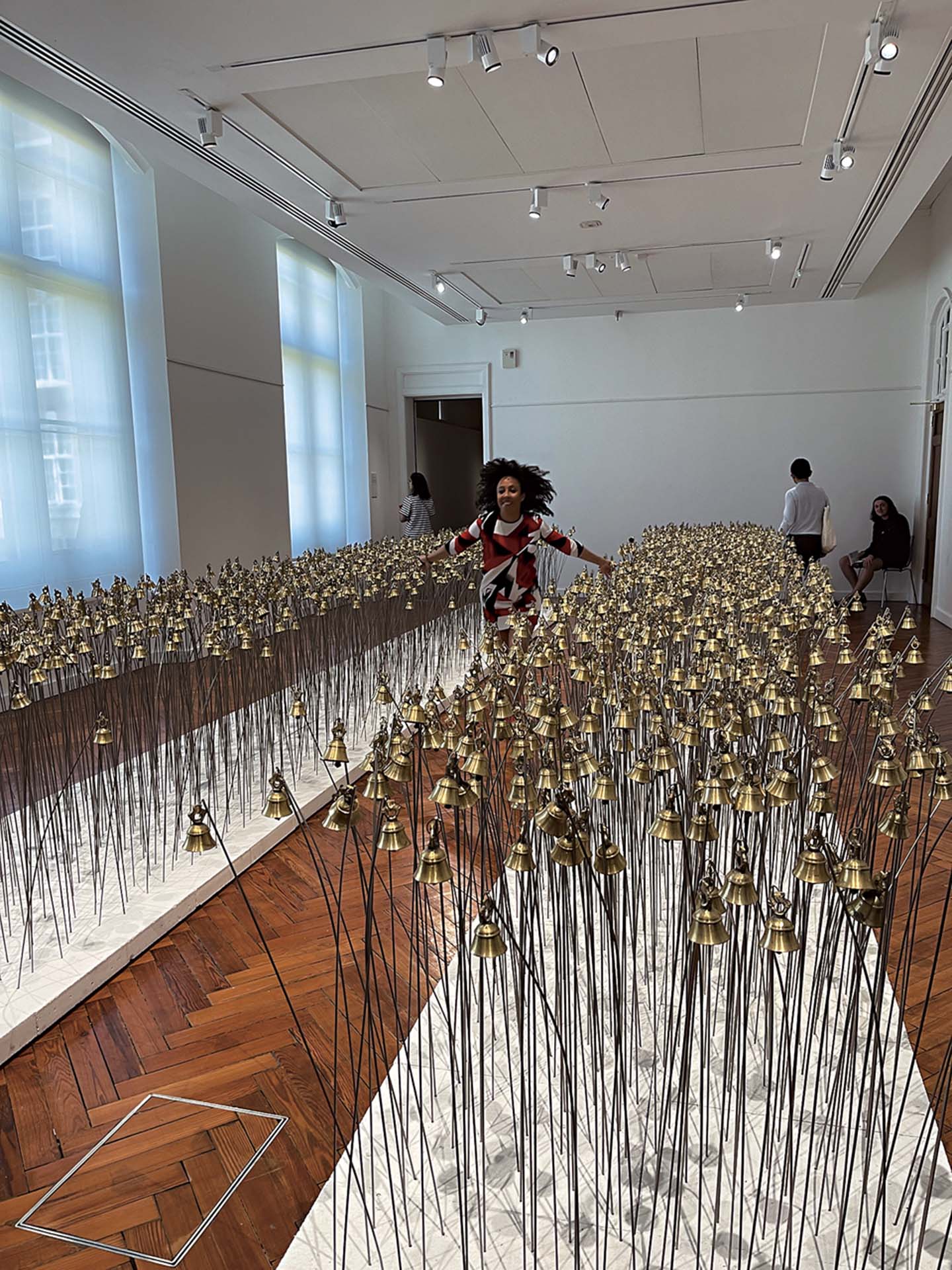 此外,葡萄牙藝術家安東尼歐.歐巴(Antonio Oba)2022年作品《花園》,兩邊整排的鈴噹像祭壇,邀請觀眾走入其中,撥響鈴聲,暗示心靈安歇、回響與傾聽。至於查曼娜.瓦奇斯(Charmaine Watkiss)2018年繪畫作品《回歸》表達那些非洲祖先傳統如何跨越大西洋的故事、儀式與風俗,並已成為加勒比海文化的一部分。她除了表達非洲-加勒比海人的離散,並引用「中間通道」(The Middle Passage)這個象徵非洲祖先漂移與離散的詞彙,以追問「我是誰?」並以《見證》(2023)中的神祇為祈福祝禱。