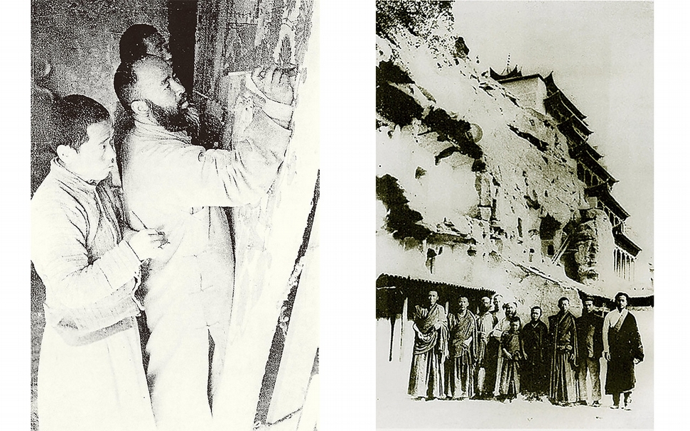 左圖為張大千在敦煌洞窟中描摹壁畫的情形,約1942年拍攝。 右圖為1943年張大千與子侄心智、心玉、喇嘛等人攝於敦煌莫高窟44窟前。(本刊資料室)