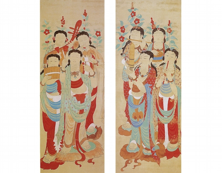 張大千約1942年〈盛唐伎樂天菩薩〉(左右兩幀),水墨設色絹本,170.5×63.5公分×2,成都四川博物院藏。