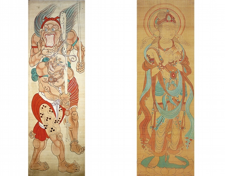 左圖為張大千約1942年描繪的〈盛唐鬼怪圖〉,水墨設色絹本,216.8×70.8公分,成都四川博物院藏。右圖是張大千約1942年〈晚唐觀音大士像〉,設色絹本,210 ×62.4公分,成都四川博物院藏。