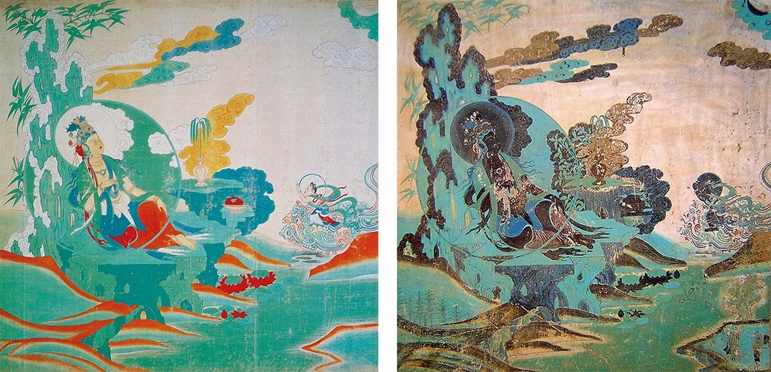 左圖為張大千約1942年〈西夏水月觀音〉,設色布本,140.8×144.5公分,成都四川博物院藏;右圖為西夏〈水月觀音〉,榆林窟二窟西壁北側壁畫原蹟。