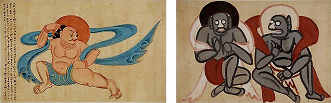 左圖為張大千約1942年〈西魏夜叉〉,水墨設色絹本,74.8×108.5公分。右圖為張大千約1942年〈北周夜叉〉,水墨設色絹本,74.8×108.5公分。二者皆為成都四川博物院藏。