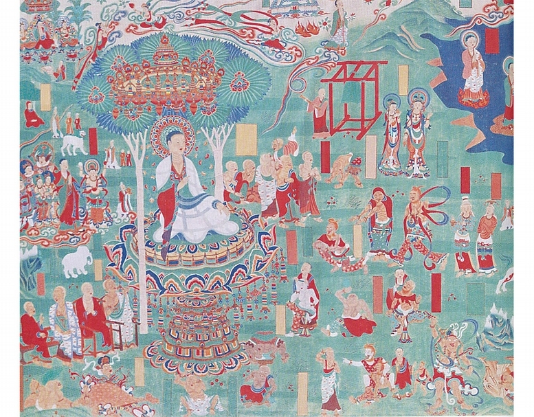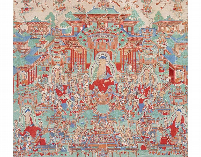張大千約1942年〈盛唐觀無量壽經變圖〉,水墨設色布本,265.5×315公分,成都四川博物院藏。