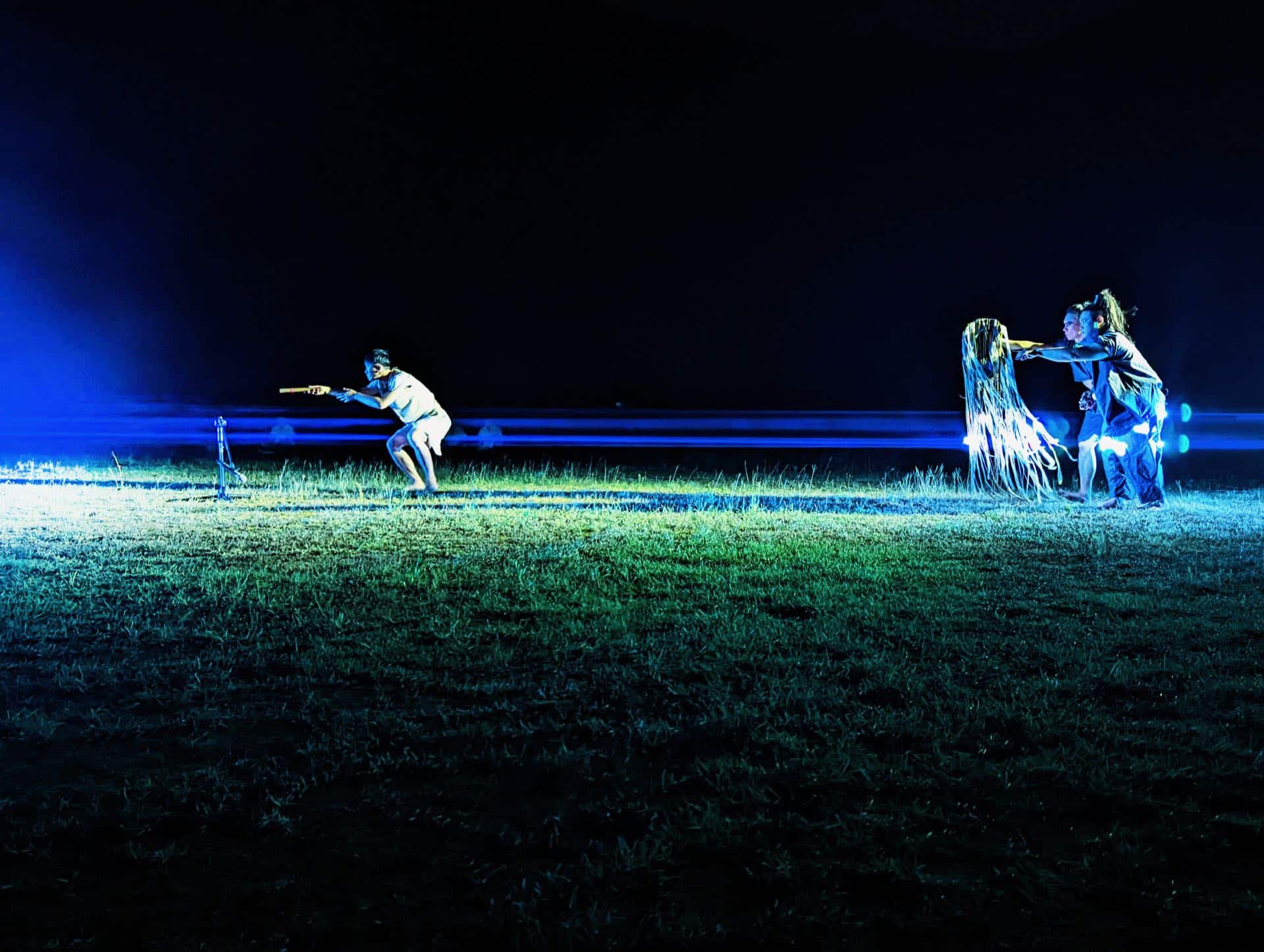 有了2010年代的濫觴,原住民酷兒藝術在往後幾年開始出現顯著、殊異的發展。以東冬為例,他在2010年代後期的巨大轉向之一,是開始以群體式的模式,在部落進行文化與藝術活動。也就是說,過往作為獨立創作者、大多面向美術館或白黑盒子空間的酷兒藝術家,開始出現了連結社群與面向群眾的轉向。(註3)於此,近乎五年時間,前述某種騷動未盡的情感,在東冬的作品或各種面向部落的藝術行動中幾乎沉寂下來;我一度以為這種社群轉向與異質的性別認同行動只能憾擇其一。直到2022年,他攜手兒路創作藝術工寮、拾回塵封十年的文本,在部落、族人面前上演《遊林驚夢:巧遇Hagay》(以下簡稱《遊》)(註4),終於將早前未盡的酷兒情感,連結到轉向社群後的藝術生命中。